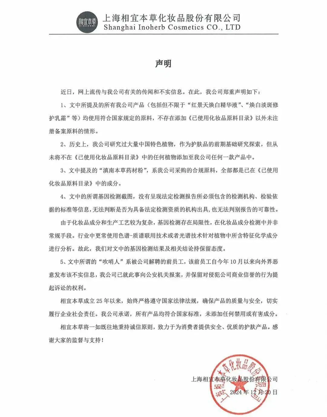 事件发酵出圈后,当晚相宜本草回应发声,一纸声明中列出了五个信息点。
