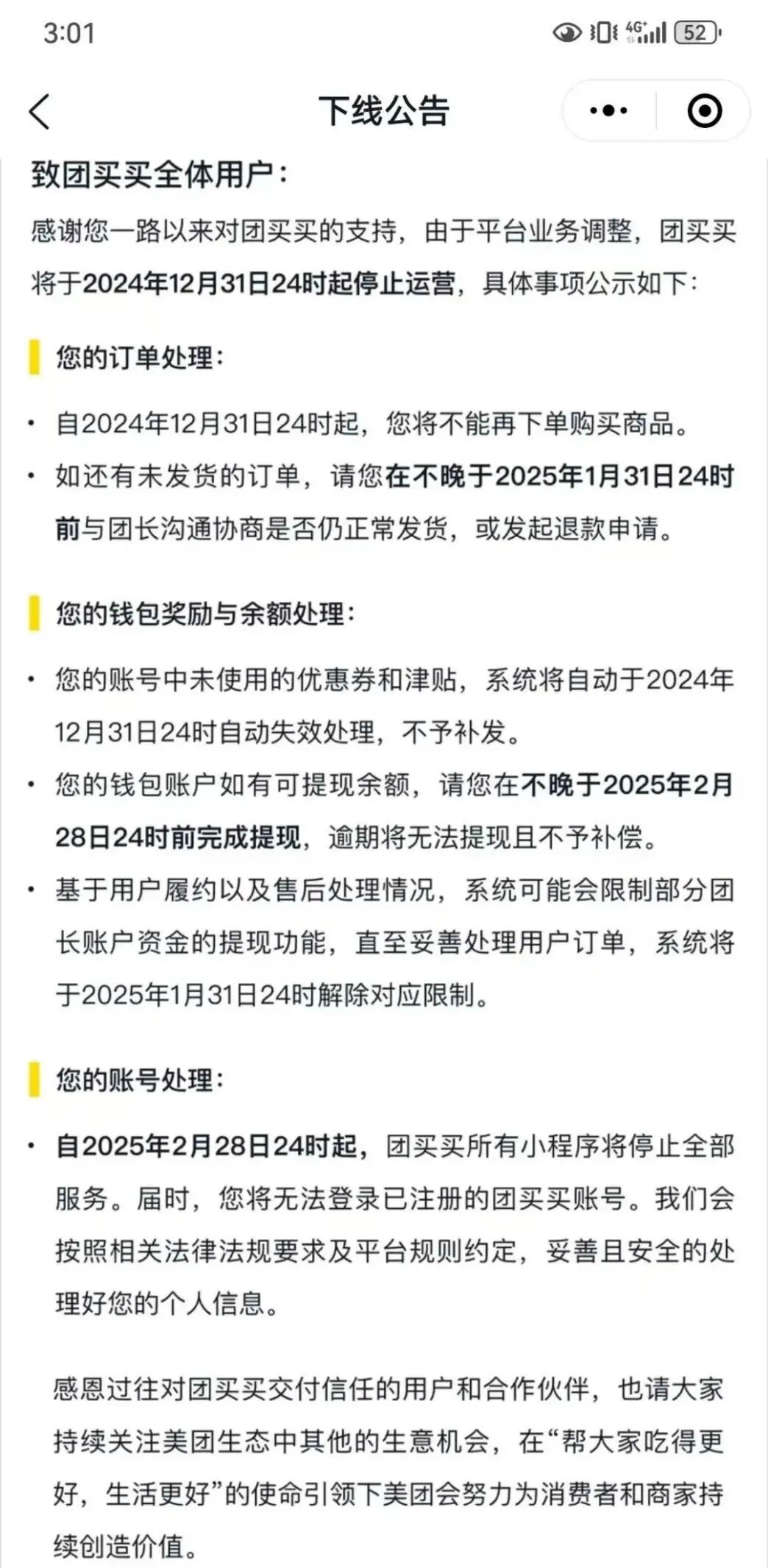 另外,自2025年2月28日24时起,“团买买”所有小程序将停止全部服务,所有用户无法登录已注册的“团买买”账号。