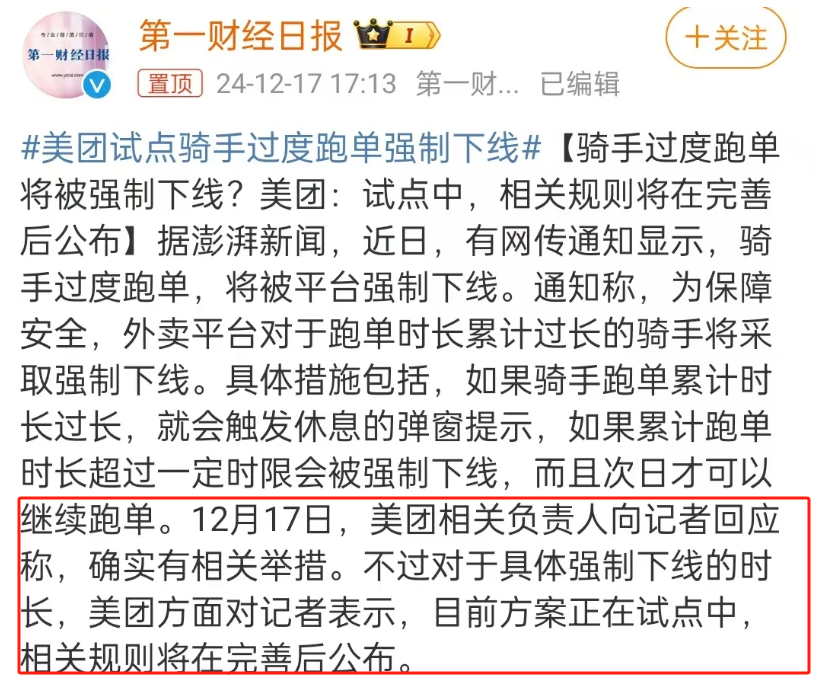 美团试点骑手过度跑单强制下线规定,此举旨在防止骑手因过度劳累引发安全风险,引发社会广泛关注与热议。
