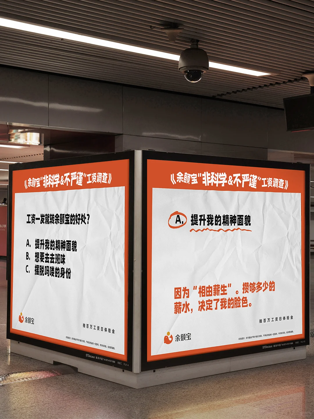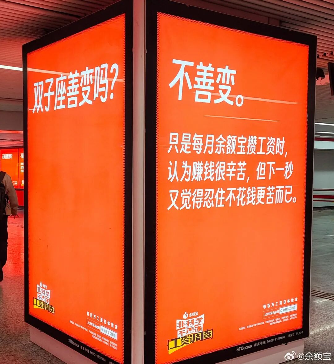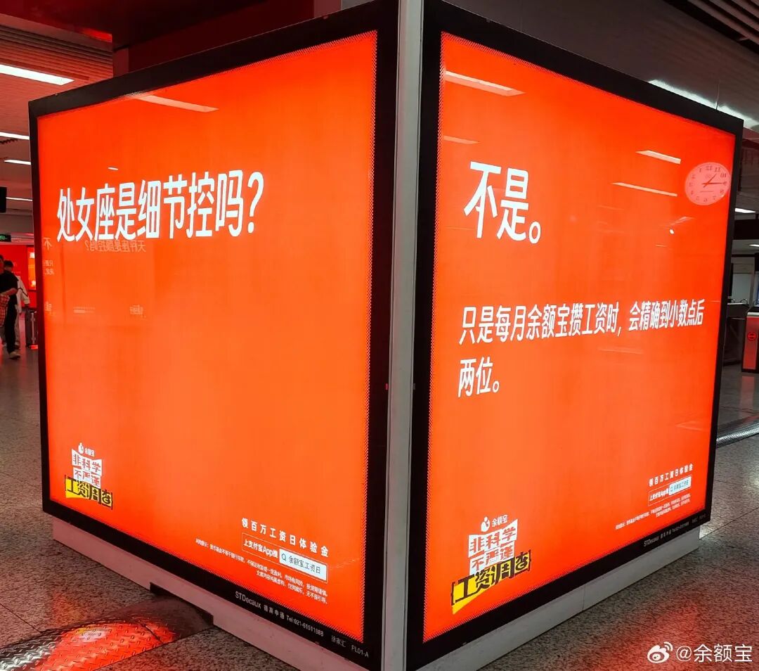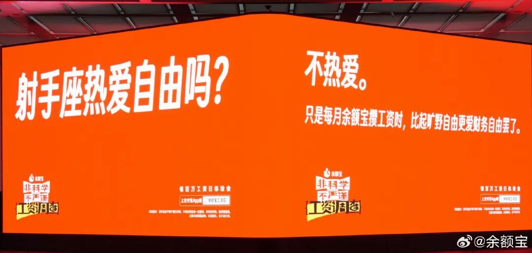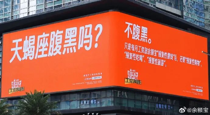 在媒介的选择上,余额宝也颇有巧思。利用转角大屏一问一答的表现形式,A面是大众对星座的刻板印象,B面则是反转有趣的各星座存工资行为,一侧提问,一侧为你揭晓趣味的反转答案,戏剧效果拉满。