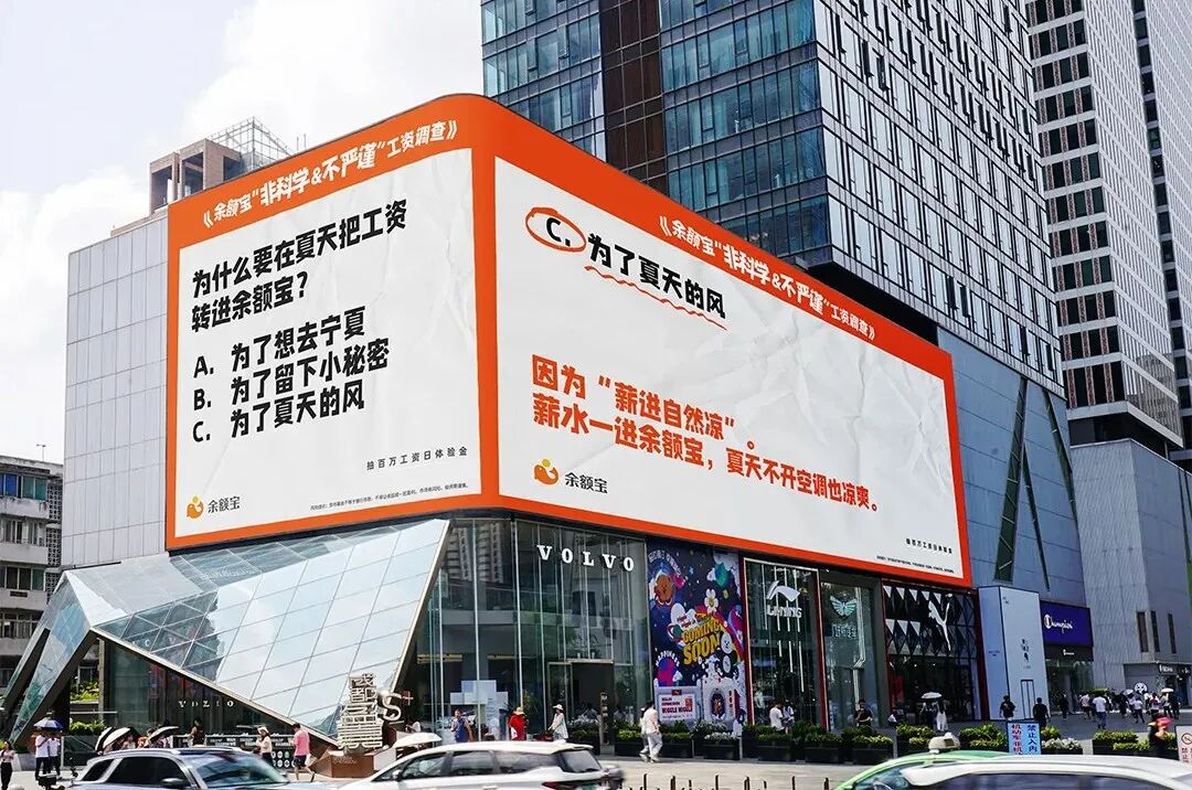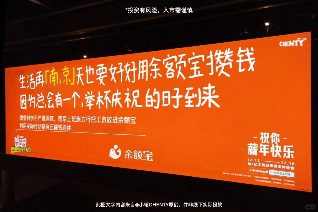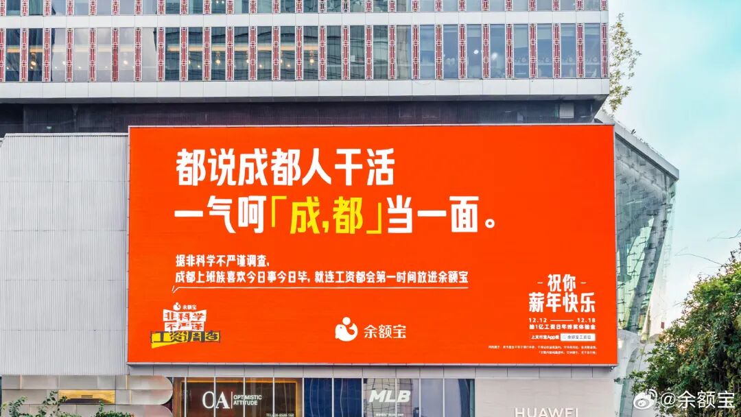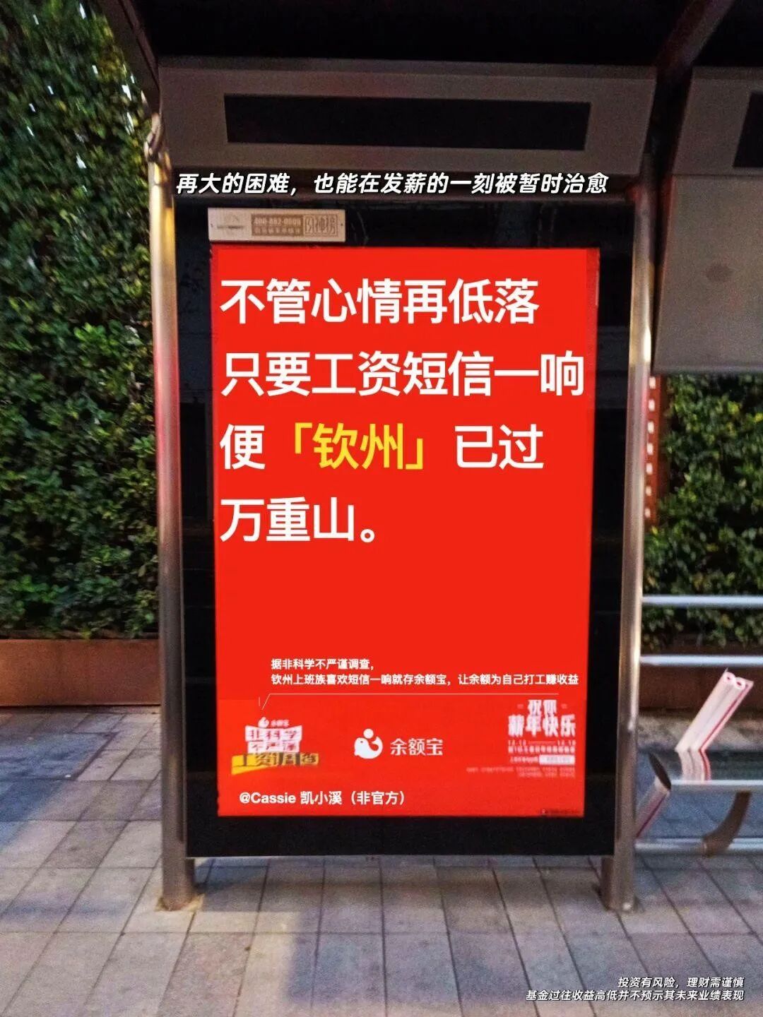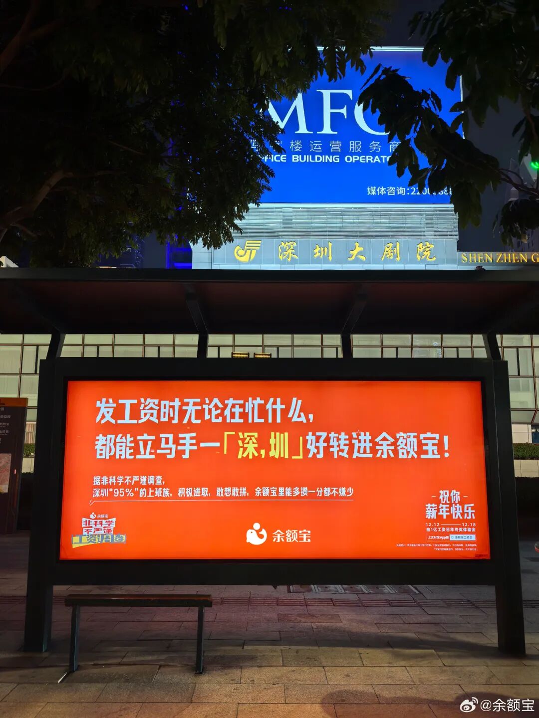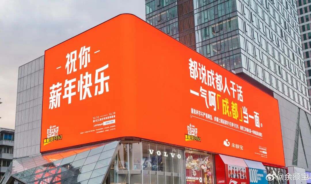 余额宝选取了成都、大理、济南、三亚、上海、宁波、深圳等7大城市,线下投放大屏广告,再次戳中打工人的情绪。