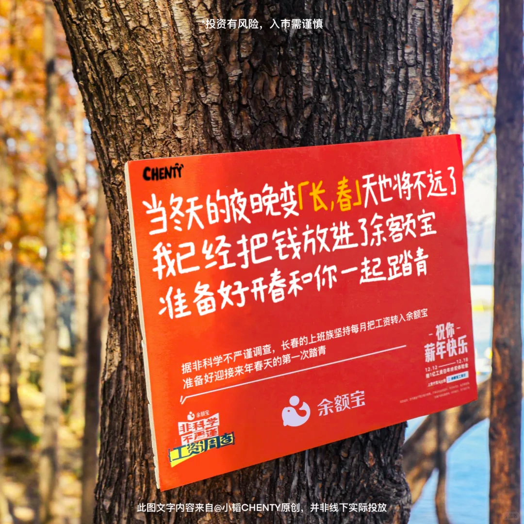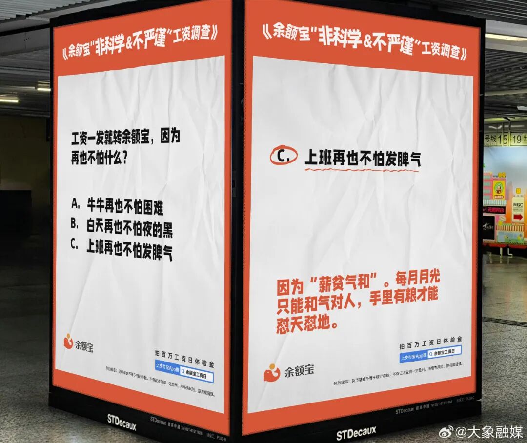 从9月开始,余额宝陆续推出系列谐音梗文案,堪称打工人的嘴替。通过解构不同城市上班族的精神状态,趣味演绎不同城市人群的存钱习惯,并将“年底的钱就放余额宝,收益总比工资卡香”植入受众心智。