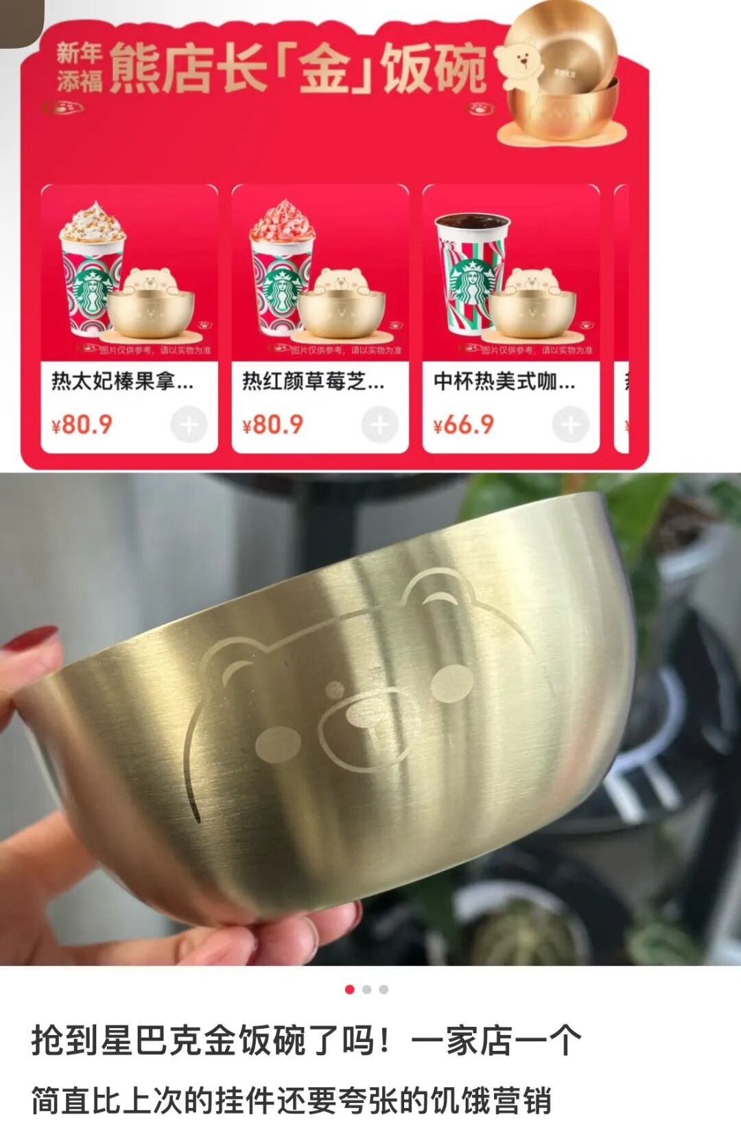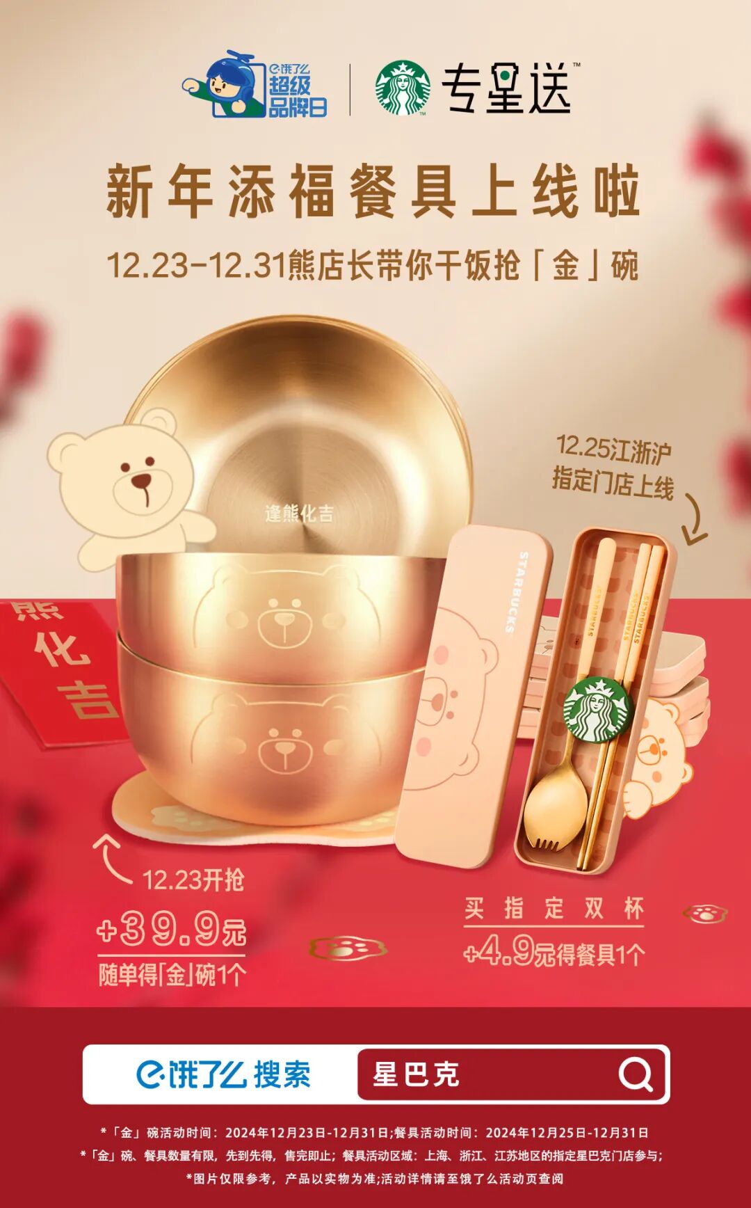 这是星巴克联合饿了么推出的新年活动,12月23日到12月31日,用户任意下单星巴克饮品,再加39.9元,就有机会抢到熊店长的添福「金」碗。