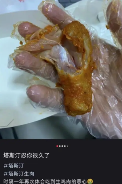 去年10月,江西南昌一网友在社交媒体上发帖,标题为“塔斯汀忍你很久了”,文案字少信息量大:“时隔一年再次体会吃到生鸡肉的恶心。”