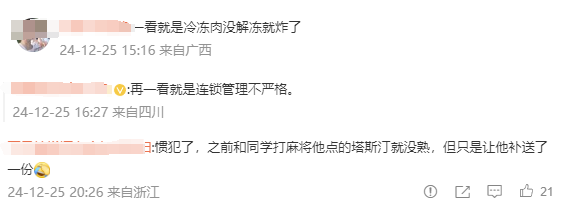 毕竟针对“生肉”问题,各大社交平台上充斥着的吐槽声还是有很多的,网友直言:“(塔斯汀)惯犯了”。