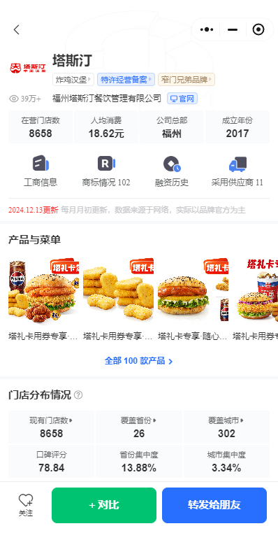 窄门餐眼数据显示,塔斯汀的人均客单价为18.62元,略高于华莱士的17.32元,但远低于肯德基的31.02元、麦当劳的27.43元、汉堡王的78.76元。