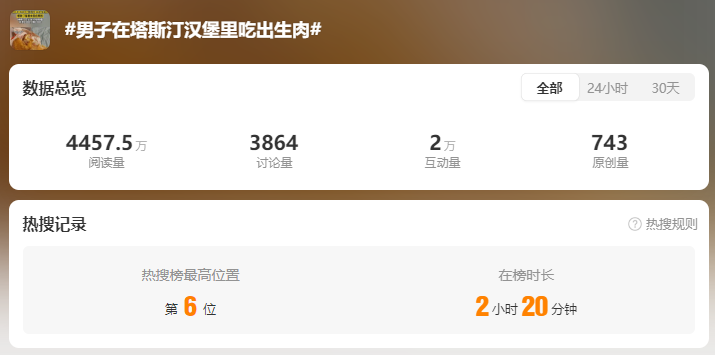 消息一出,引起了全网的高度关注,#男子在塔斯汀汉堡里吃出生肉#话题迅速冲上了微博热搜。