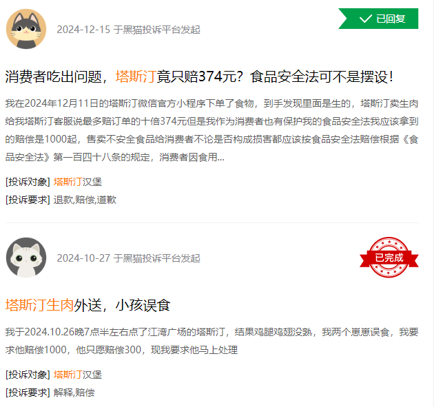 事情看似解决了,实则并没有完全解决,因为吃出生肉这样的“个例”事件在塔斯汀屡见不鲜。