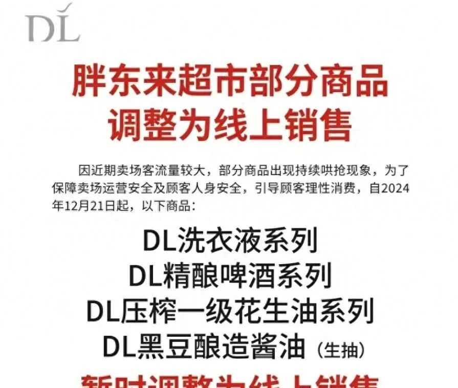 至12月21日,胖东来又宣布:将洗衣液系列、精酿啤酒系列、压榨一级花生油系列、黑豆酿造酱油暂时调整为线上销售,以保障卖场运营安全及顾客人身安全,引导顾客理性消费。