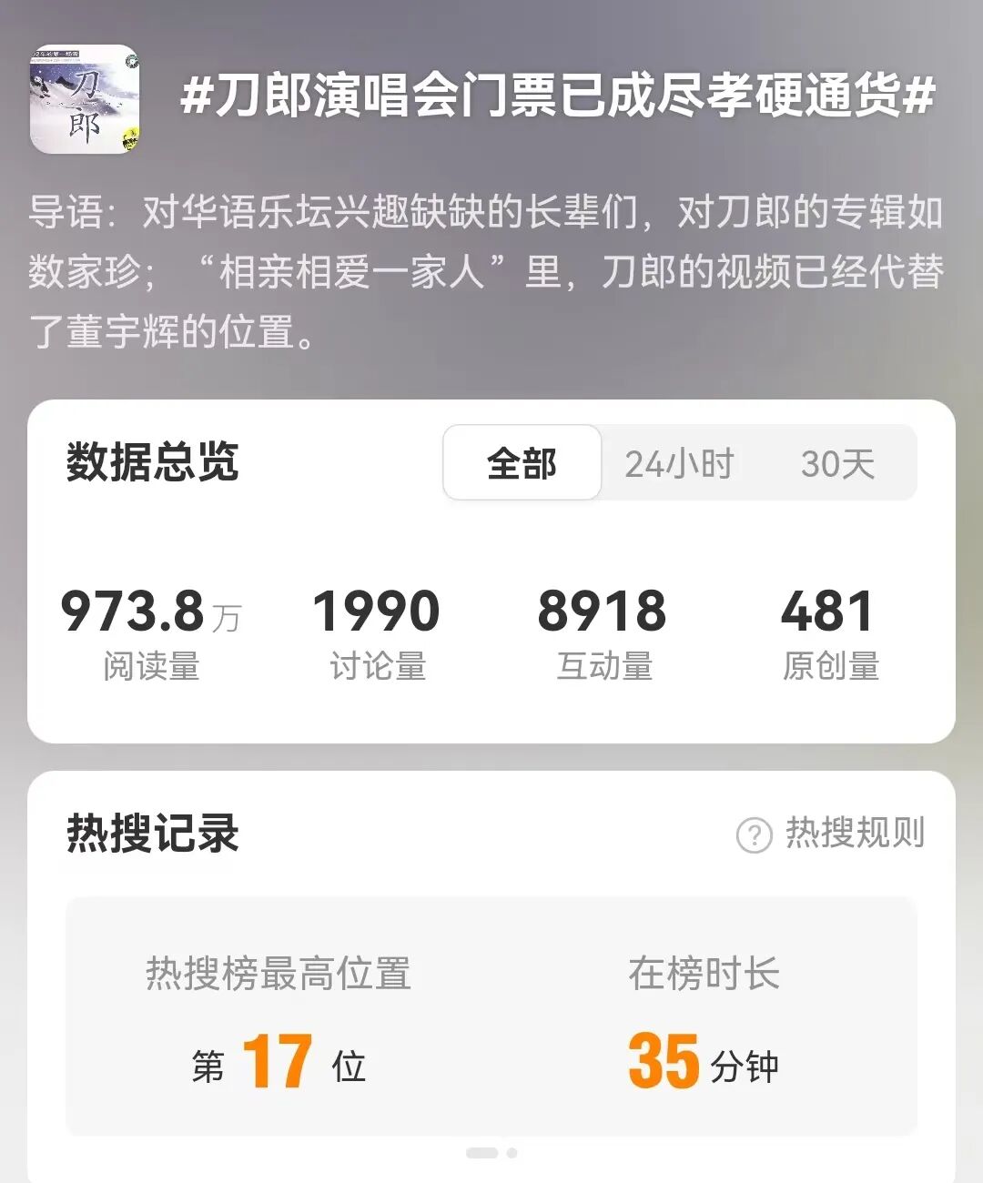 于是乎,抢票的重担就落到了年轻人身上,在微博上,#刀郎演唱会门票已成尽孝硬通货##刀郎成了中年人的霉霉#等话题高居热搜,也就是说,在16号那天同李明抢票的,有不少是跟他抱有相同想法、为父母抢票的年轻人们。