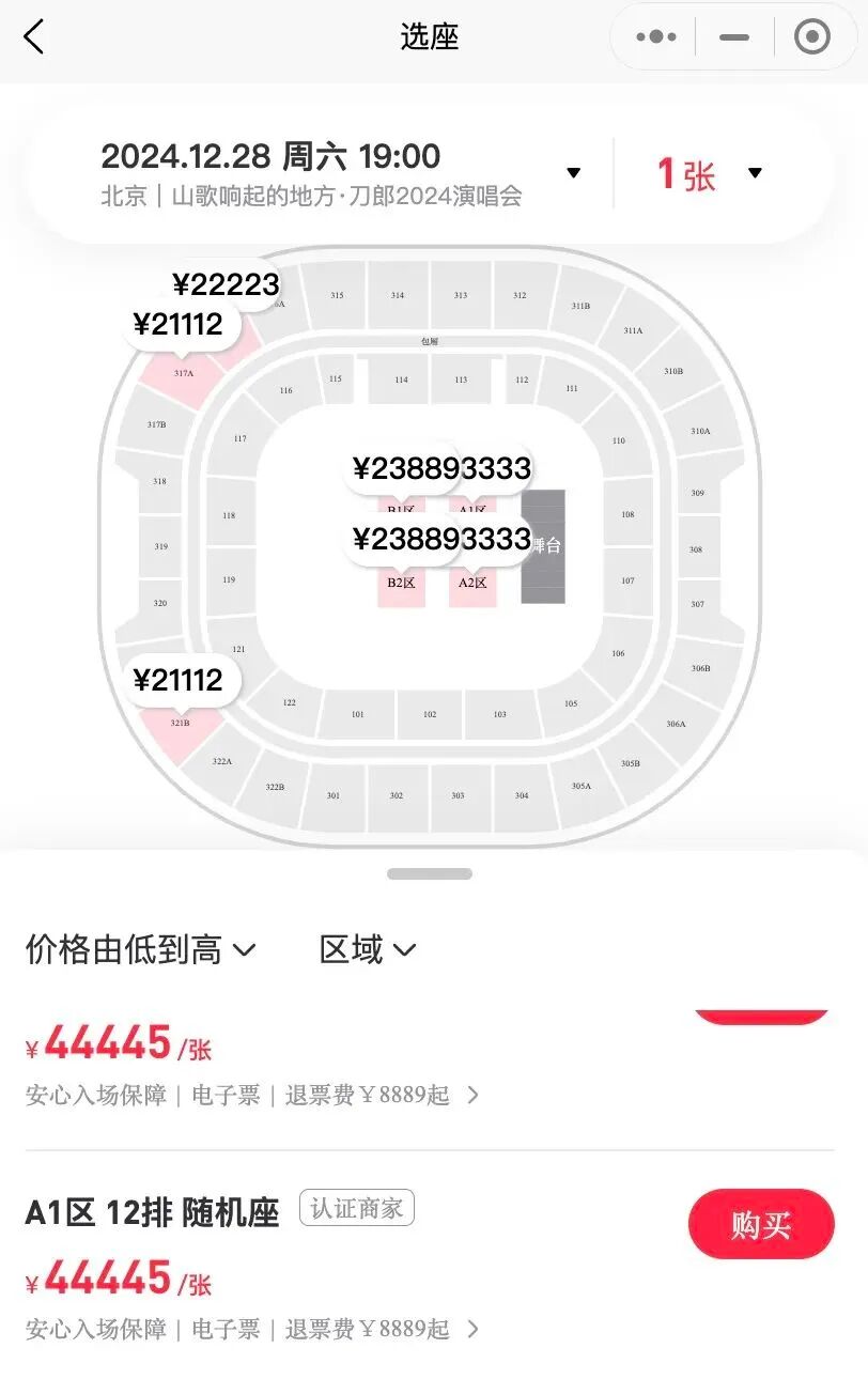 事实上,在二级票务平台“摩天轮”小程序上刀郎的门票确实被炒到了天价,不过是不是真的会有人花5万元买一张刀郎演唱会门票这事确实有待考证。