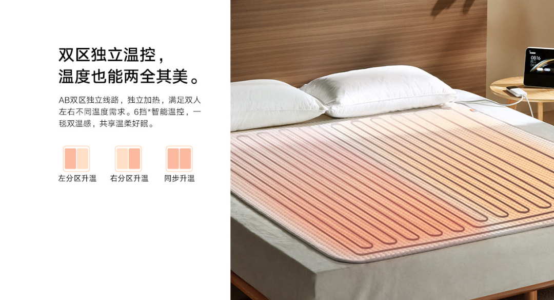 第一种的前提是有两个人躺在同一张床上,若这两个人对于睡眠温度的需求不一样,小米电热毯的分区加热功能就开始发挥作用了。