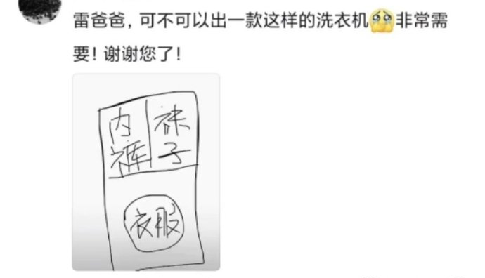 据说,之前就一直有网友在雷军社交动态评论区留言,提议小米做一款三区洗衣机,让衣服、袜子、内裤都找准各自的位置。