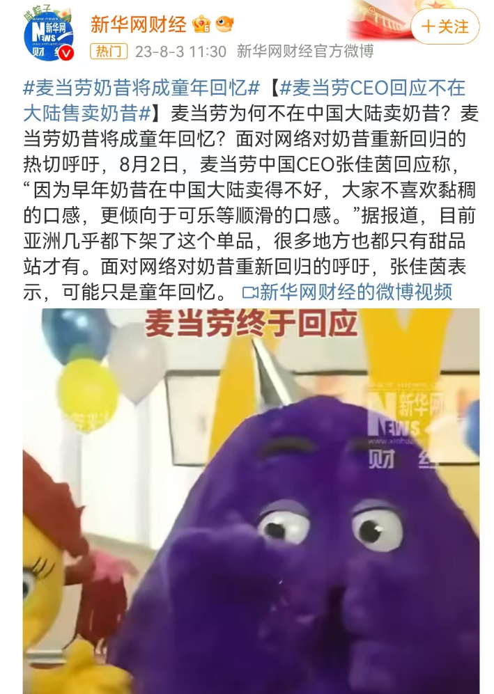 好比奶昔对于麦门而言,代表着童年的美好时光,自下架后就局限于港澳等地供应。
