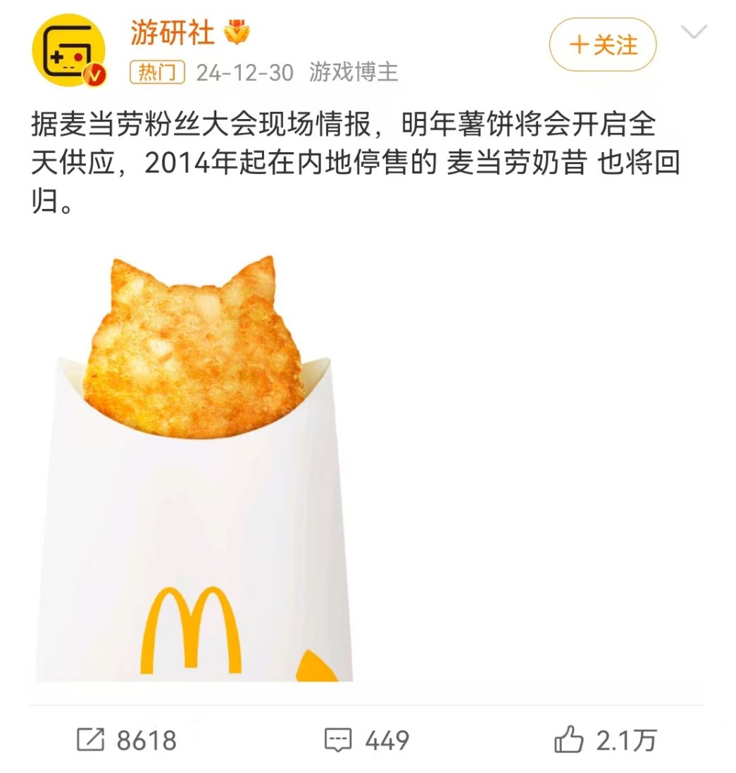 这就要说到另一个“坏消息”,麦当劳即将全天供应薯饼。