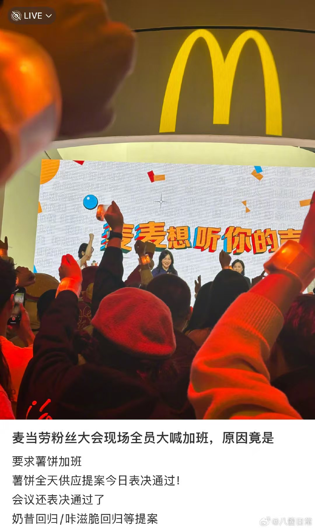活动现场就是设计有请粉丝共同参与决策的环节,包括薯饼全天供应提案表决通过;关于奶昔即将回归,现场也投票草莓风味胜出。