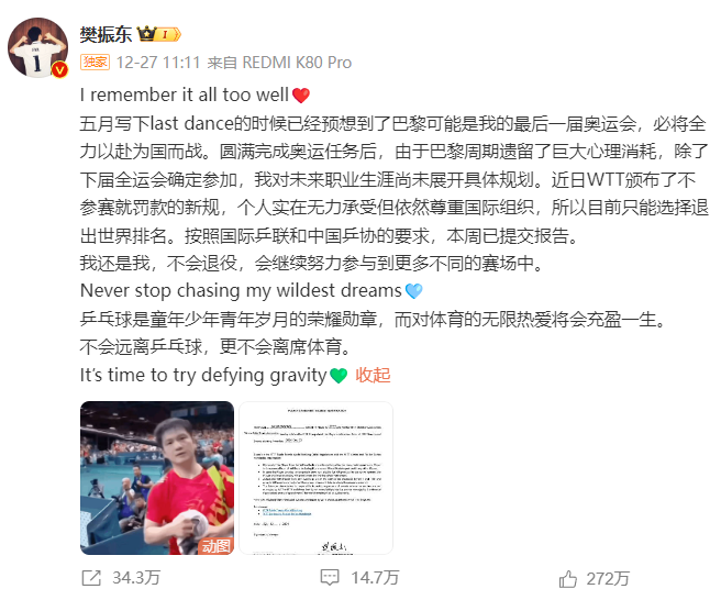 12月27日樊振东、陈梦先后发文宣布退出世界排名。