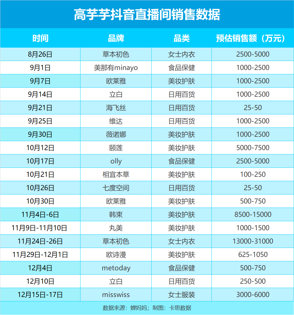 回溯到今年8月,她开启了直播带货之旅,首场直播便与草本初色强强联合,预估销售额稳稳落在2500万至5000万这一区间,打响了漂亮的第一枪。