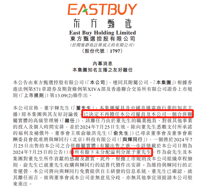 时间来到2024年7月25日,俞敏洪的“爱将”——董宇辉无预警的宣布“单飞”,并以 7658 万元收购与辉同行(实则为俞赠予董)。