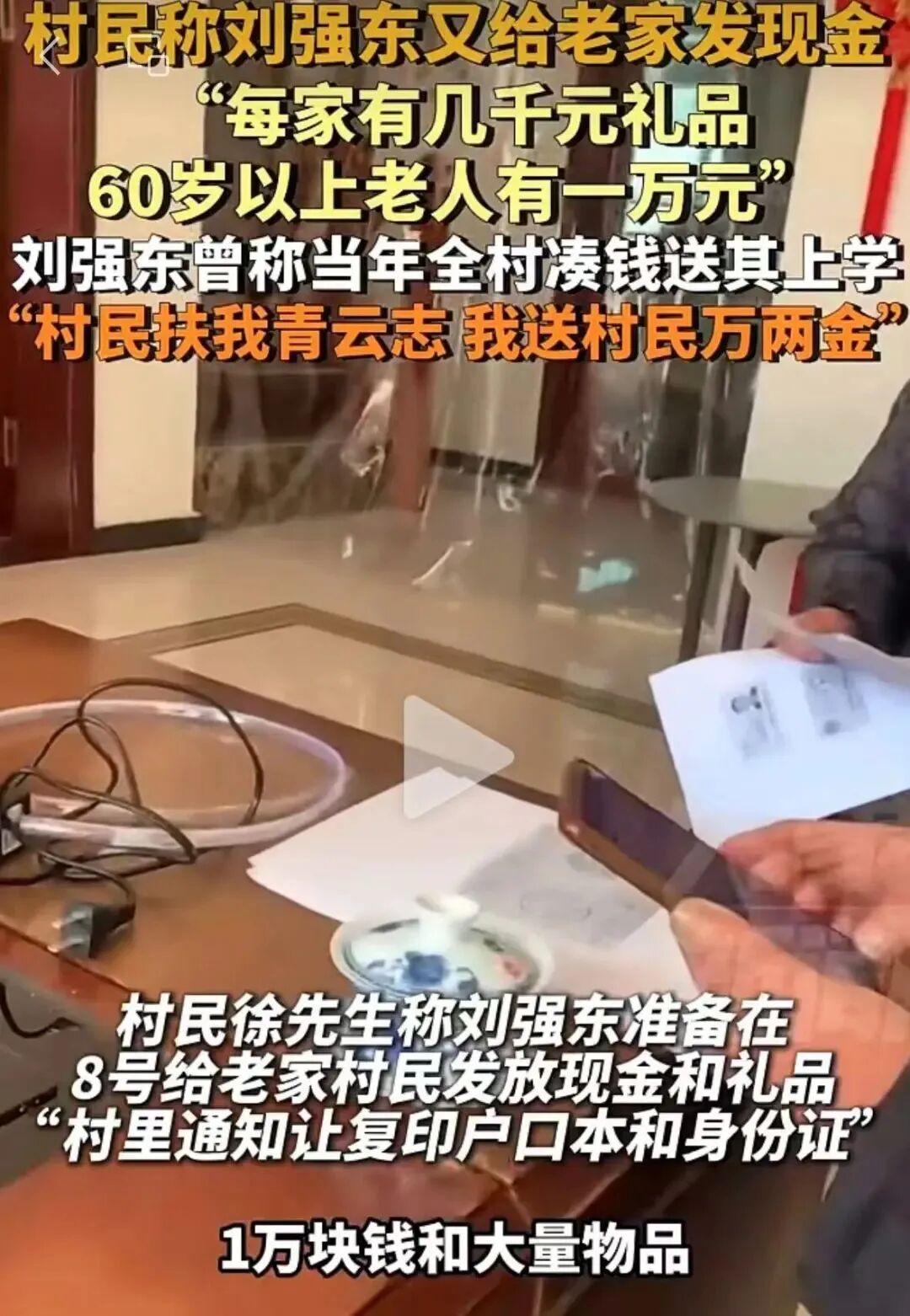 “每家有几千元礼品,60岁以上老人有一万元”,据报道称,礼品与现金的具体发放时间都已确定在8号,目前村长在挨家挨户通知宣传,让村民们复印户口本与身份证届时领取。