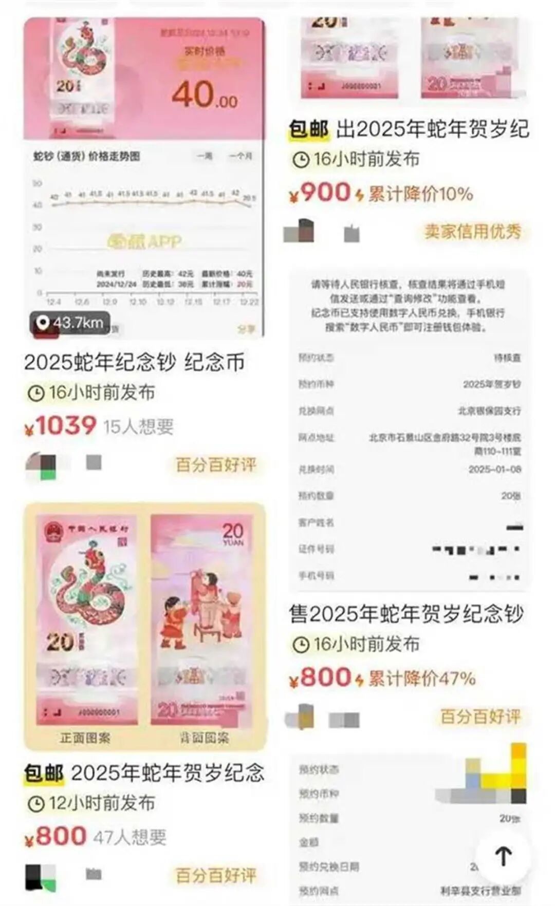 当日闲鱼上,蛇年纪念钞的用户报价高得惊人,普遍在 800 元至 1000 元之间,相较于发行价格(一张 20 元,一套 400 元),溢价幅度高达 100%至 150%。