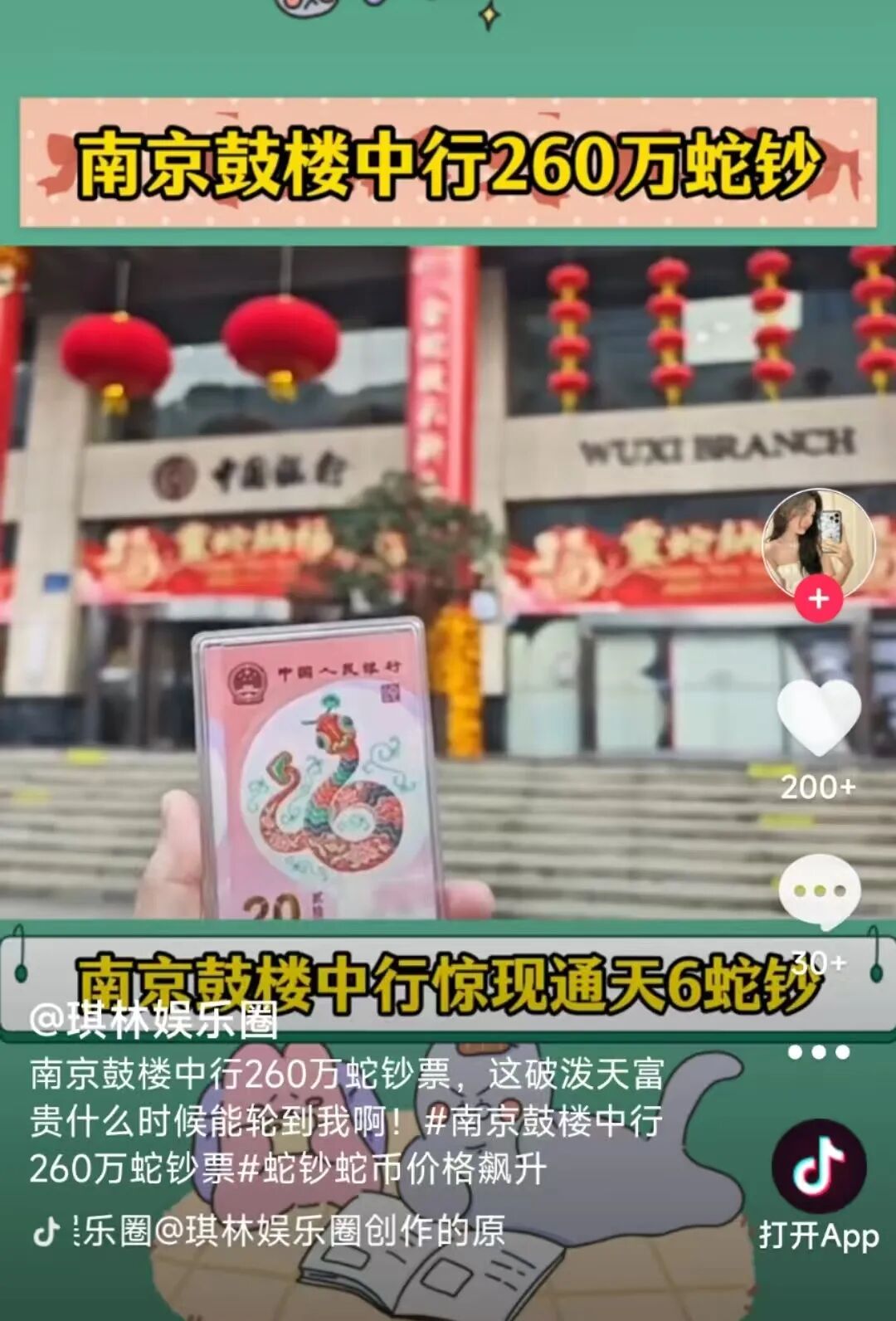 其三,大学生的踊跃参与为“蛇钞”行情添了一把熊熊烈火。在众多银行网点,与去年“龙钞”“龙币”的兑换场景相比,今年多了不少青春洋溢的年轻面孔排队兑换。