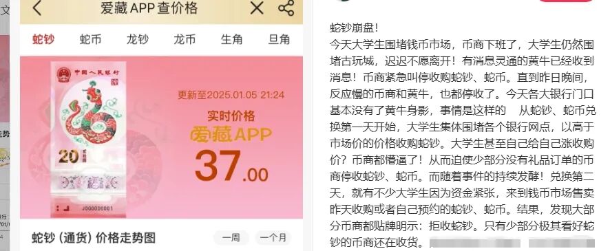 1 月 4 日中午,风云突变。几乎所有的黄牛、币商都察觉到市场的异样,整个上午全是前来出售蛇钞、蛇币的,买家寥寥无几。真正有需求的人因价格过高望而却步,而不需要的人却还在拼命哄抬价格。