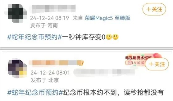 然而,自从蛇年贺岁纪念币和纪念钞开启网上预约后多家银行相关预约网页出现卡顿、无法访问等情况。也有网友反映,手机不停地接收银行验证码,就是抢不到,“秒空”已是常态。