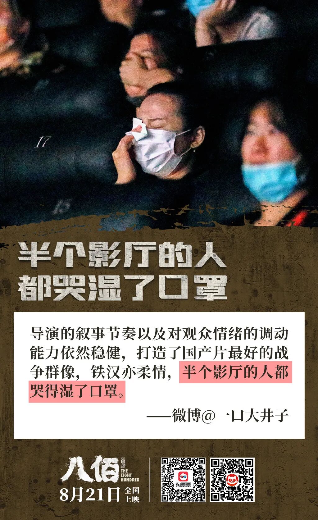 在这场「爱国」campaign里,《八佰》天然的题材优势无论从何种角度来说都是对家国意义的完美诠释,从而找到观众情感的最大公约数——爱国情怀,一举击中软肋,让其缴械投降。