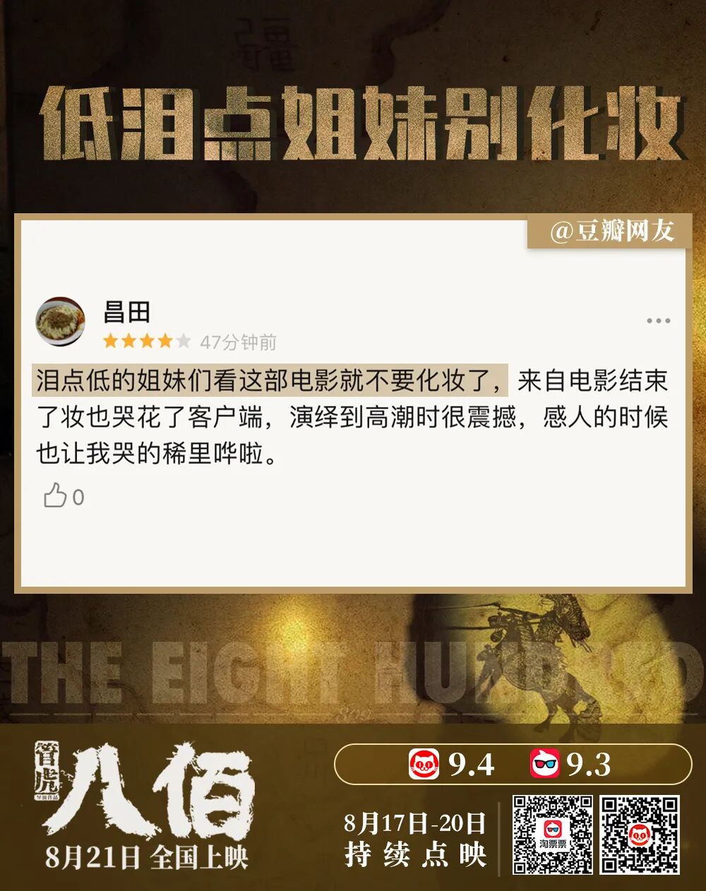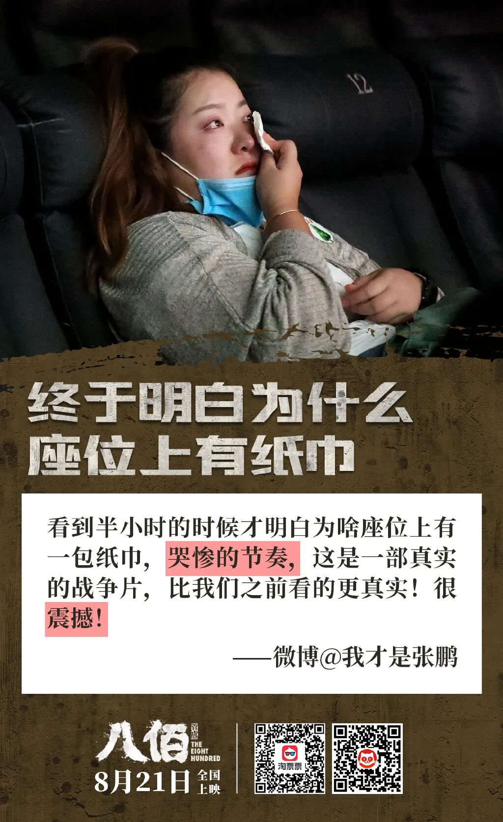 如果说圈层向爆款不需要辐射至全民的主流话题,关键在于精准抓住圈层目标受众的痛点。那么像《八佰》这样题材的影片则天然的具有全民主流话题的属性。