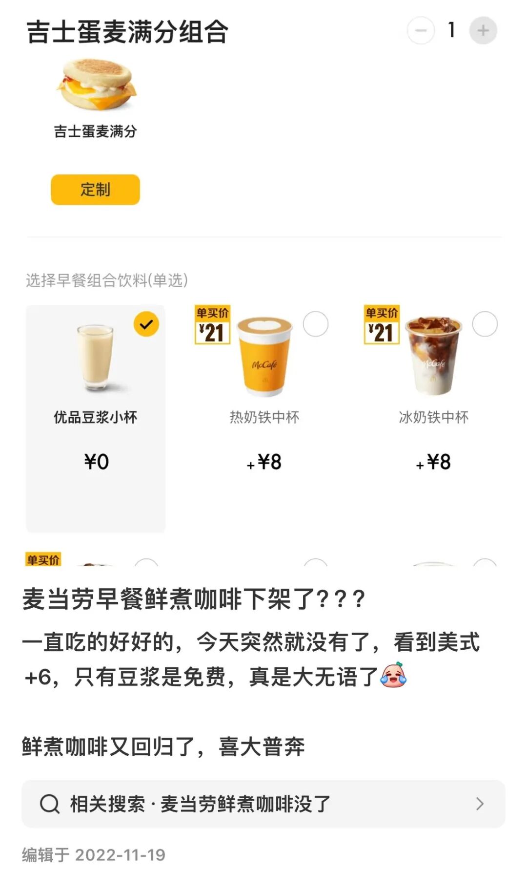 不过,也有麦当劳员工透露,门店下架鲜煮咖啡主要是为了提高麦咖啡的销量,但顾客如果点了豆浆,是可以到店要求换成鲜煮咖啡的。