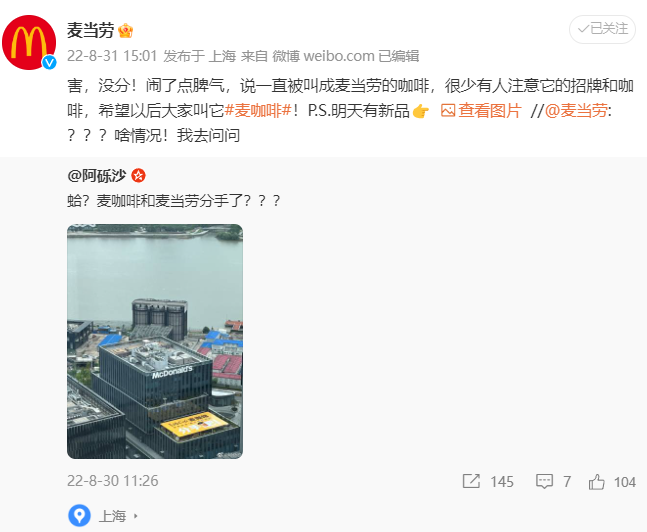 随后,麦当劳回应称,“害,没分!闹了点脾气,说一直被叫成麦当劳的咖啡,很少有人注意它的招牌和咖啡,希望以后大家叫它麦咖啡。”