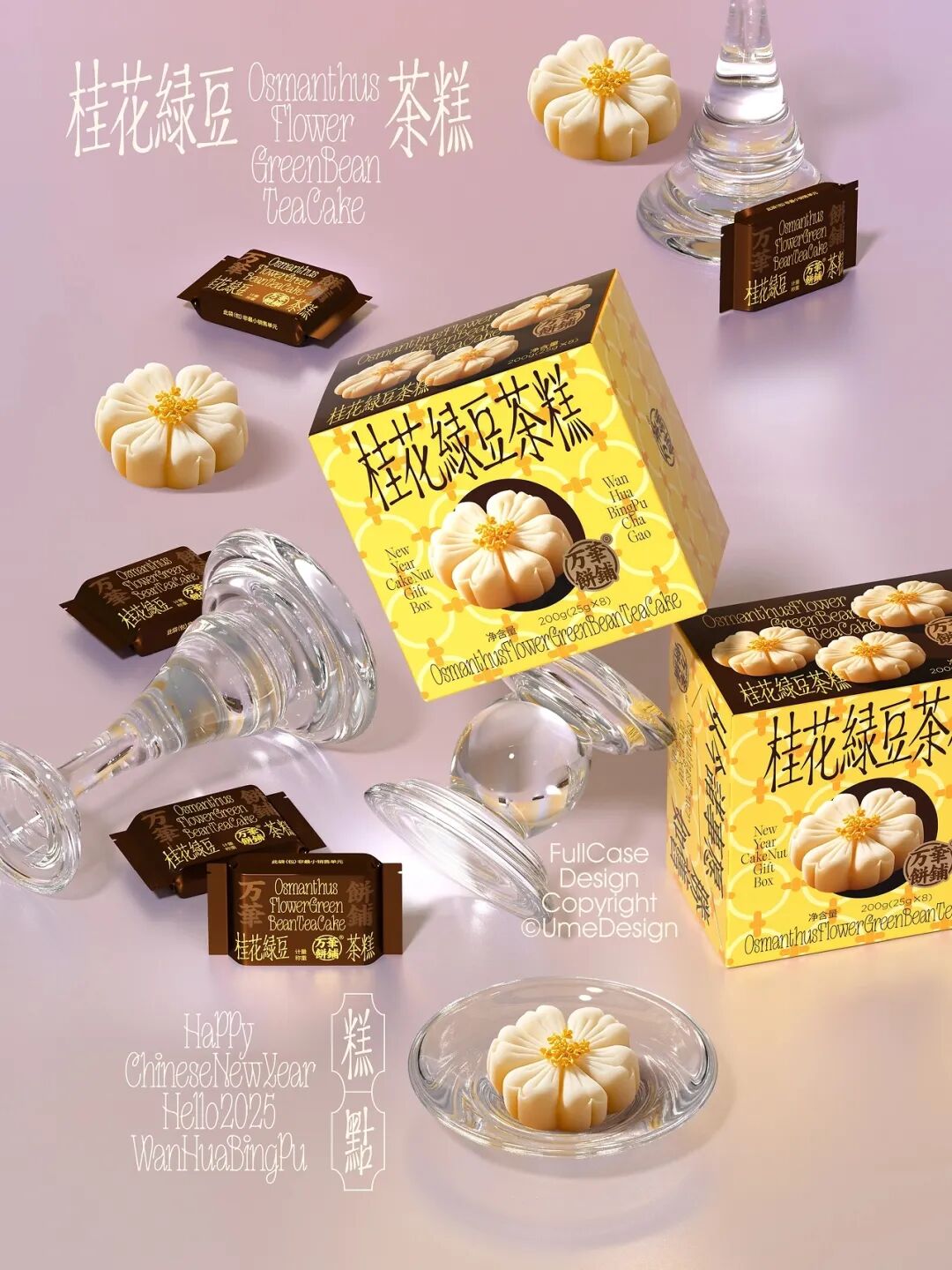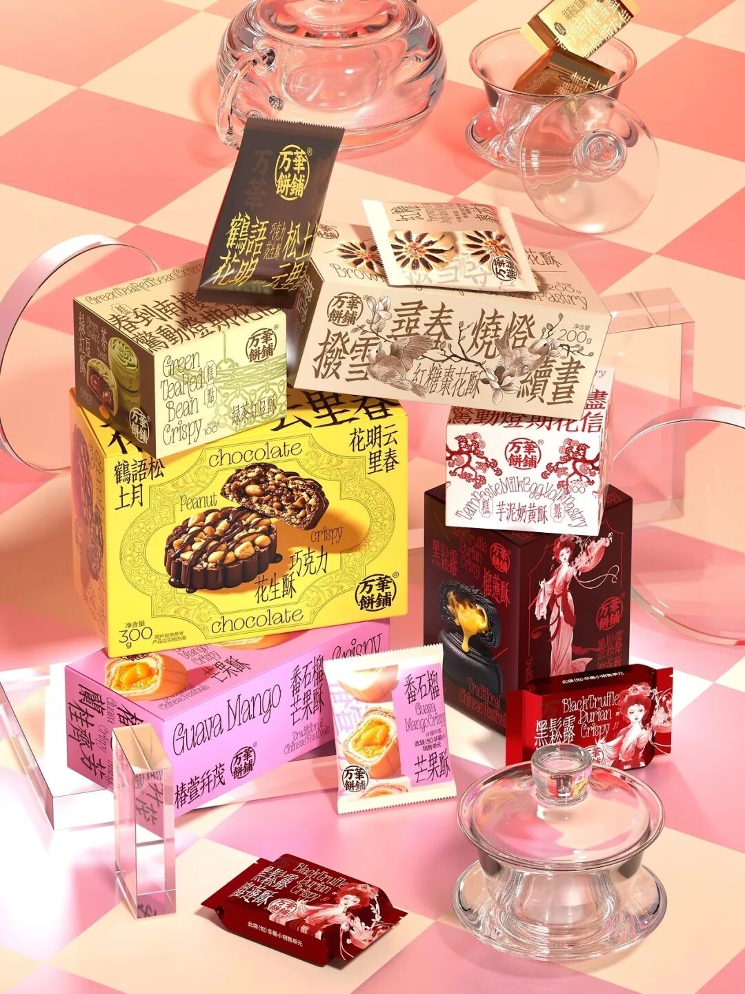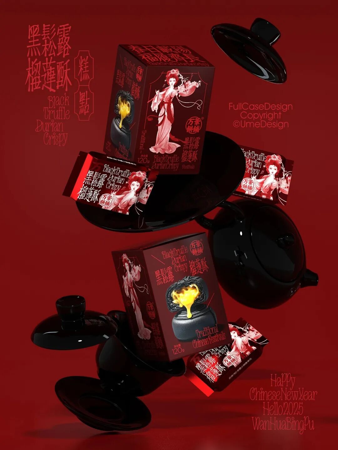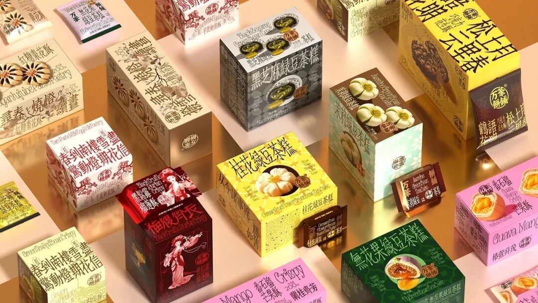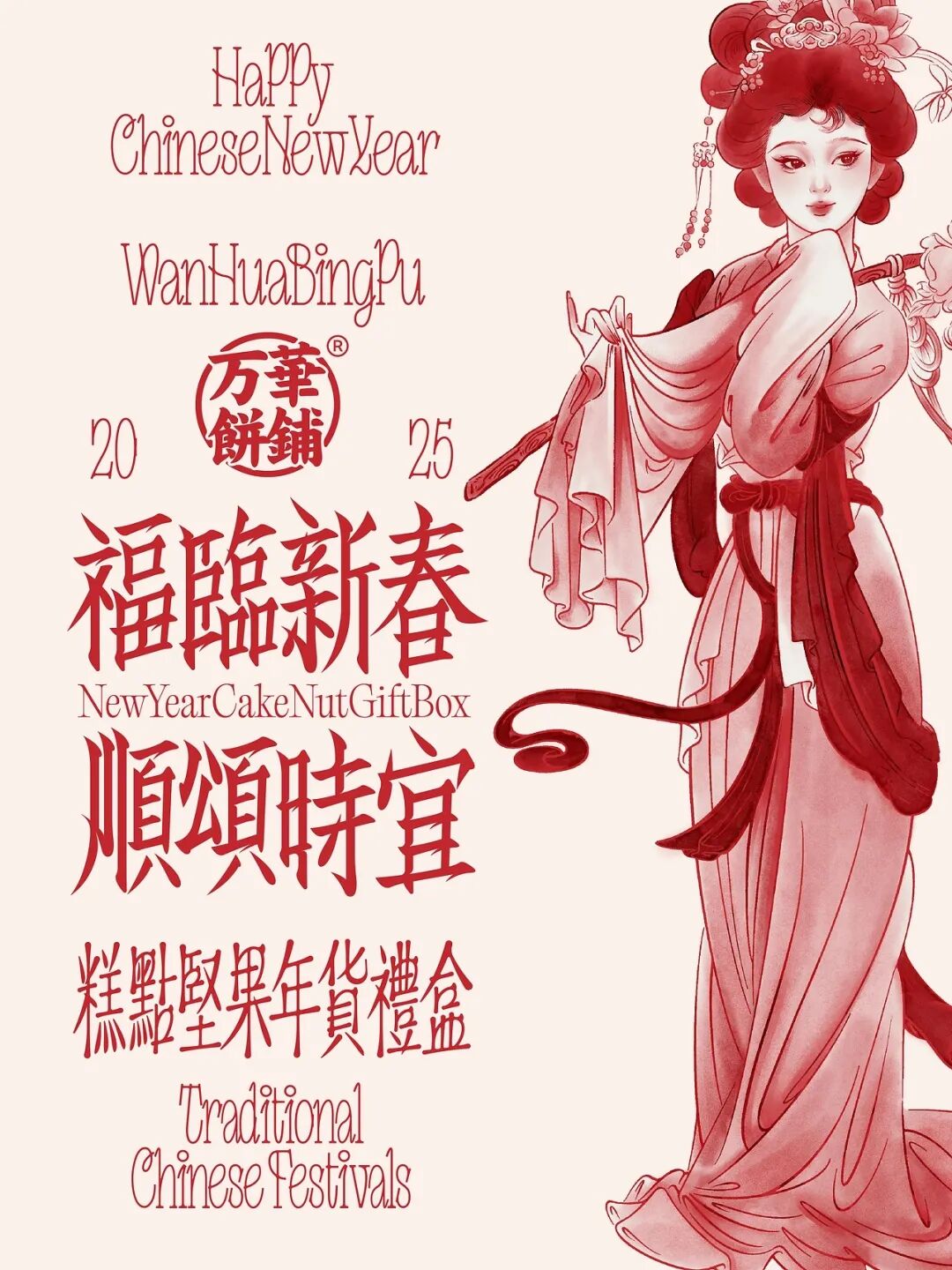 这款年货礼盒,延续品牌向来的“繁复”风格,以纤细利落的书法体搭配糕点绘画,衬以中式传统纹样以及高饱和度的色彩组合,赋予包装极具张力的视觉效果。