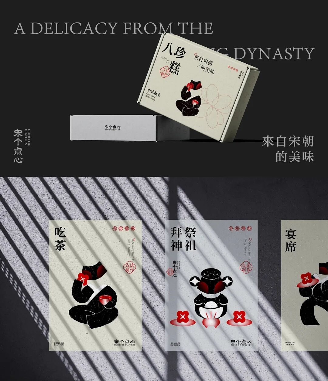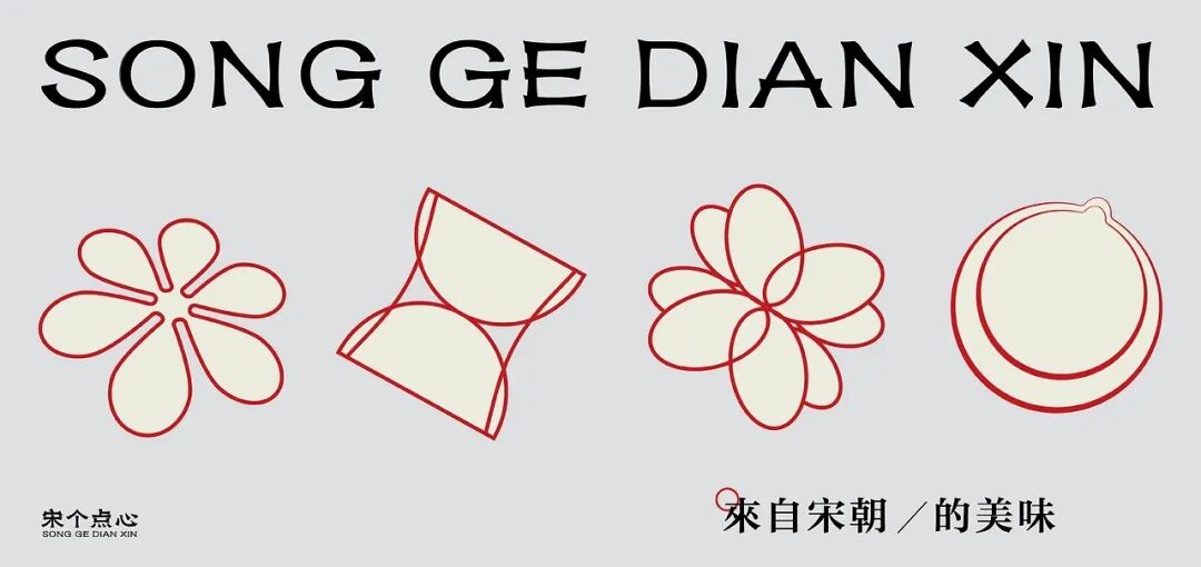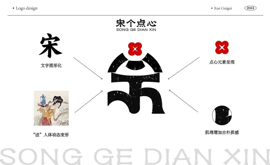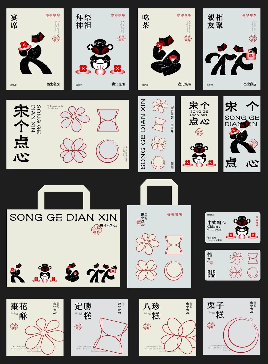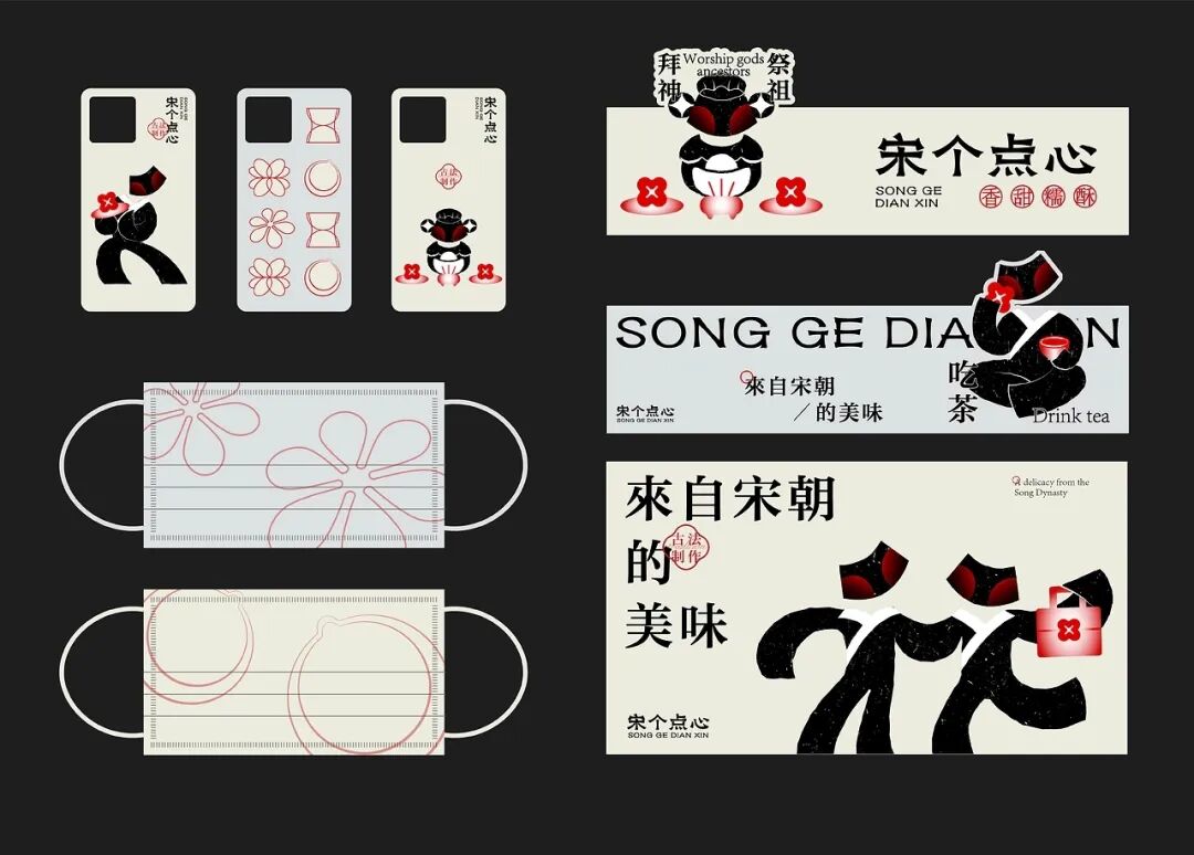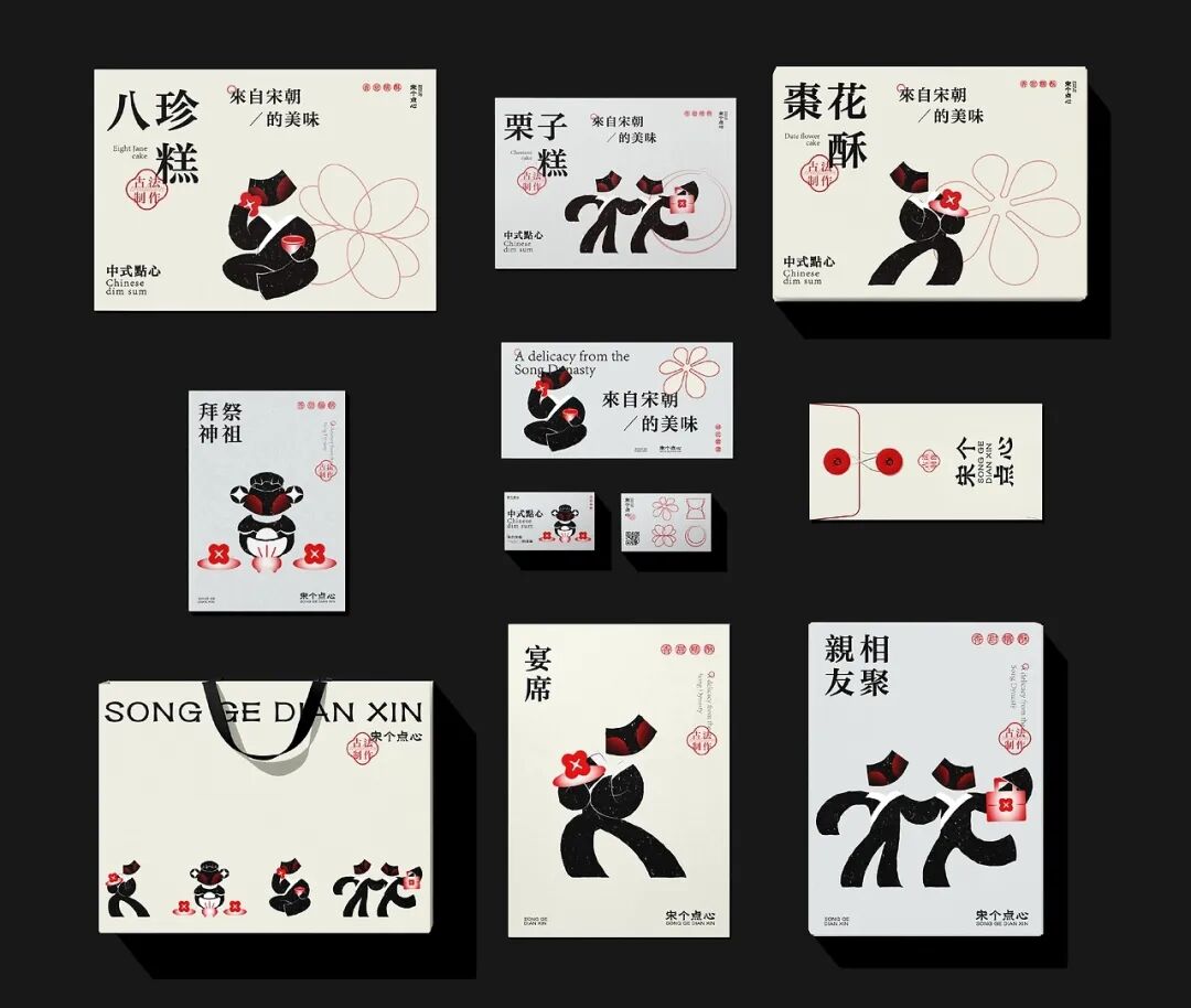 设计方面,首先LOGO标识便以“宋”字展开,深化品牌基因--整体字形选择以图形化的方式呈现,更是结合送礼场景的“送”字的人体动态做变形,搭配肌理感纹理增加古朴质感;顶部的一点更是以红色点缀呈现点心元素,呼应糕点属性。