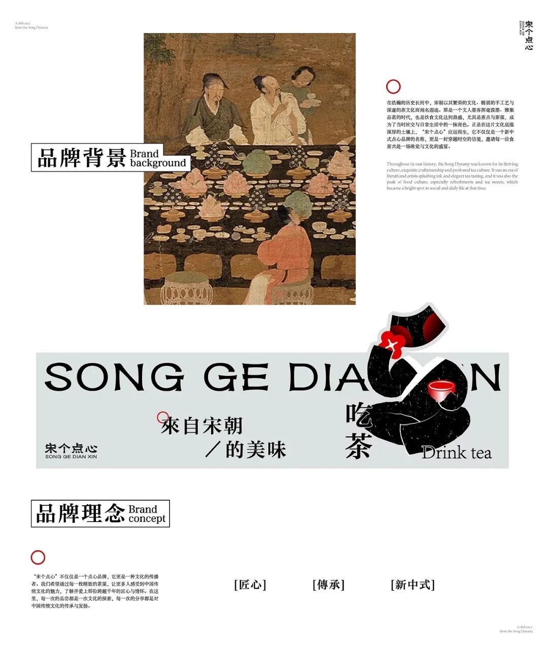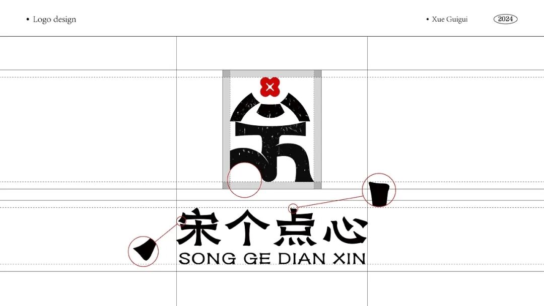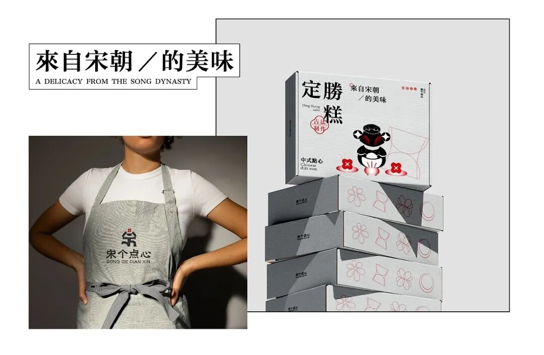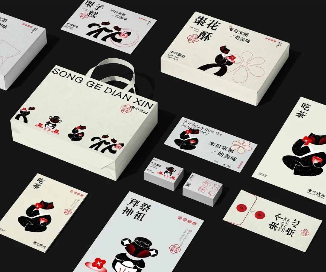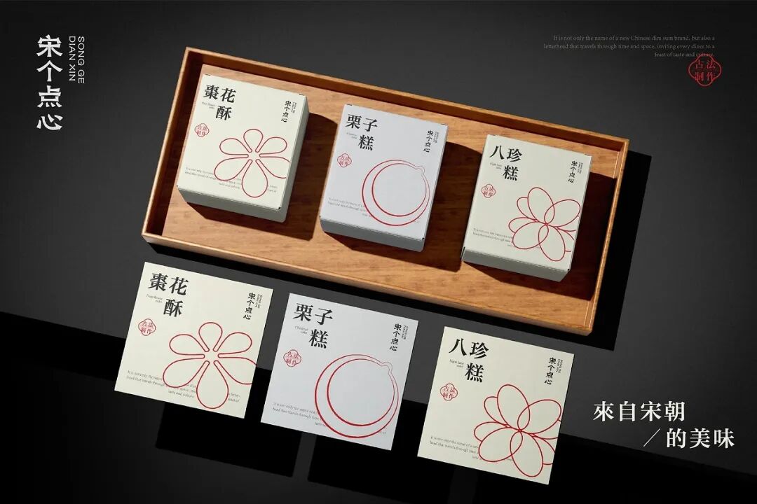 设计方面,首先LOGO标识便以“宋”字展开,深化品牌基因--整体字形选择以图形化的方式呈现,更是结合送礼场景的“送”字的人体动态做变形,搭配肌理感纹理增加古朴质感;顶部的一点更是以红色点缀呈现点心元素,呼应糕点属性。