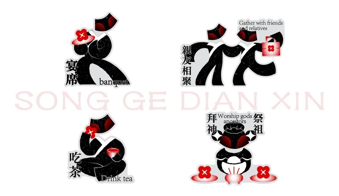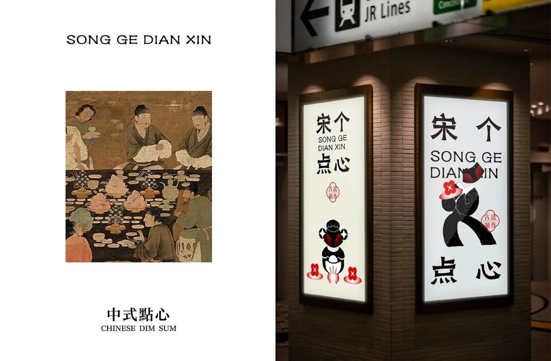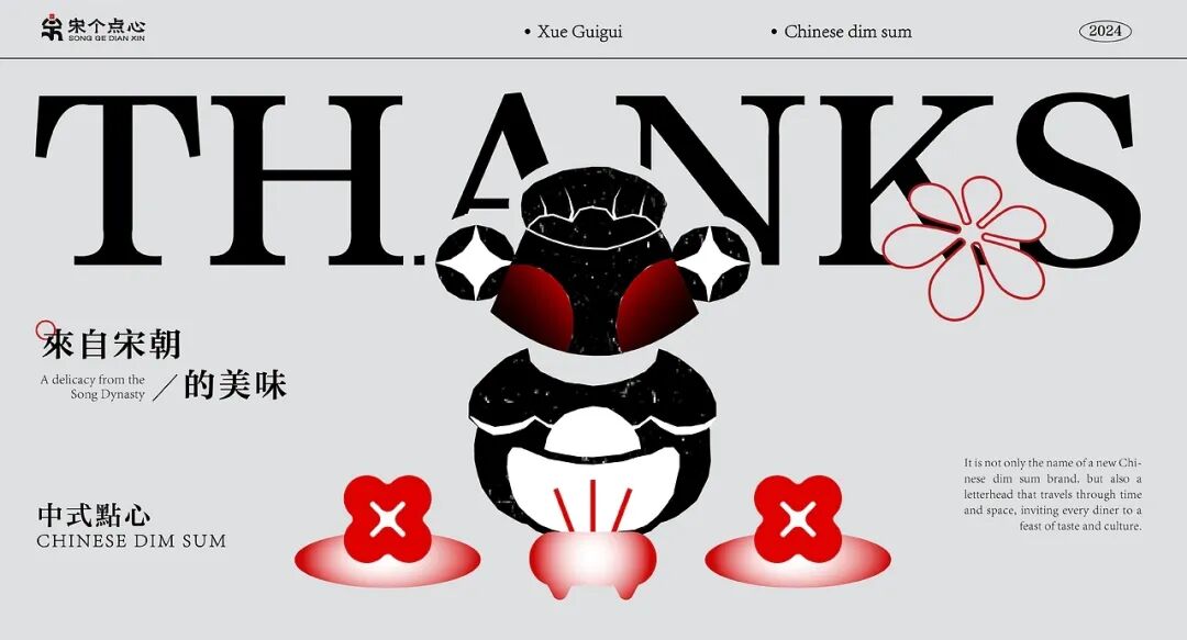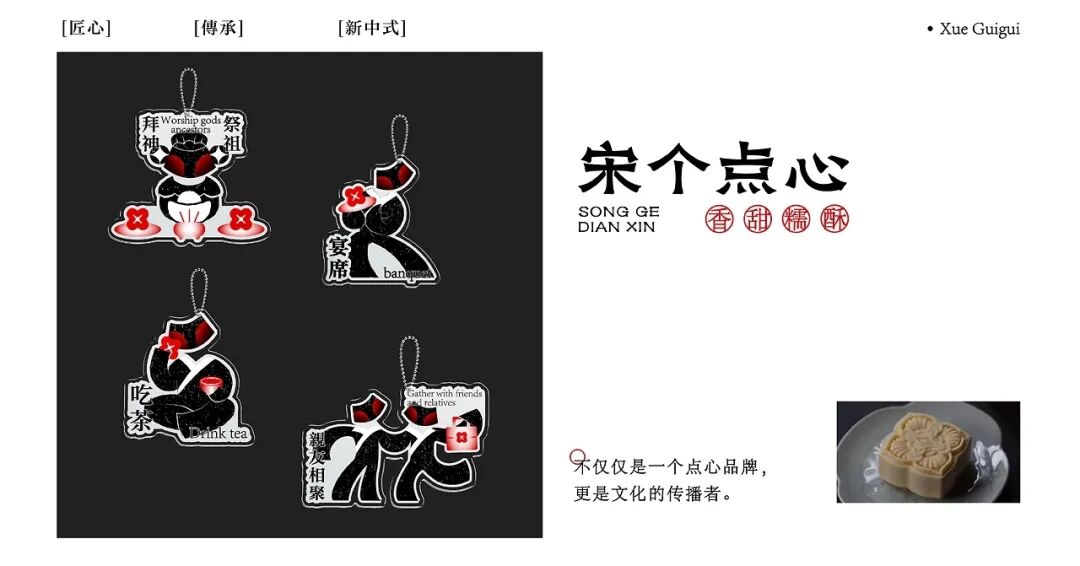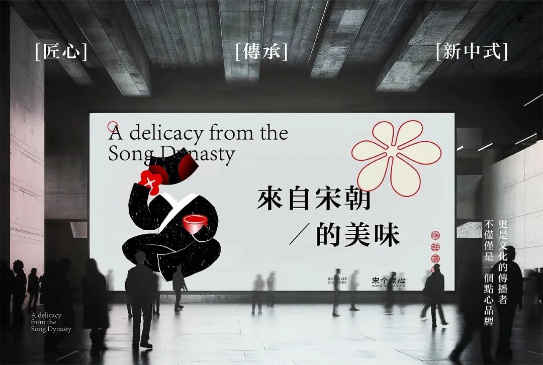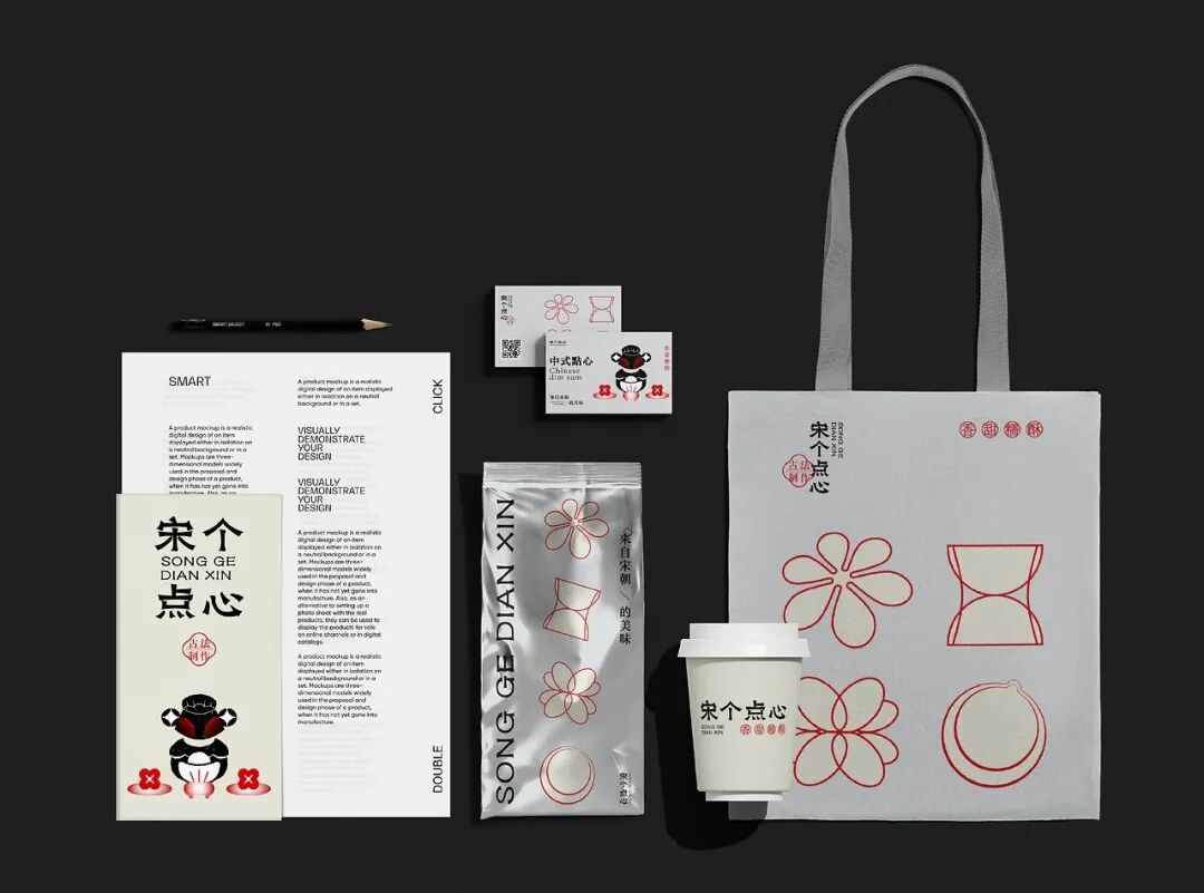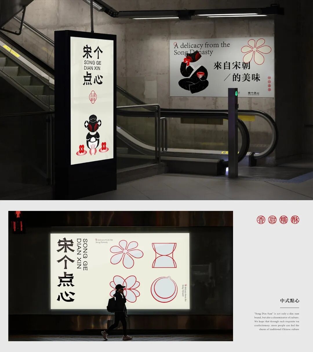 设计方面,首先LOGO标识便以“宋”字展开,深化品牌基因--整体字形选择以图形化的方式呈现,更是结合送礼场景的“送”字的人体动态做变形,搭配肌理感纹理增加古朴质感;顶部的一点更是以红色点缀呈现点心元素,呼应糕点属性。