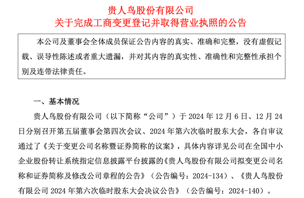 根据公告,在2024年12月,贵人鸟召开的第五届董事会第四次会议和2024年第六次临时股东大会,各自审议通过了《关于变更公司名称暨证券简称的议案》。