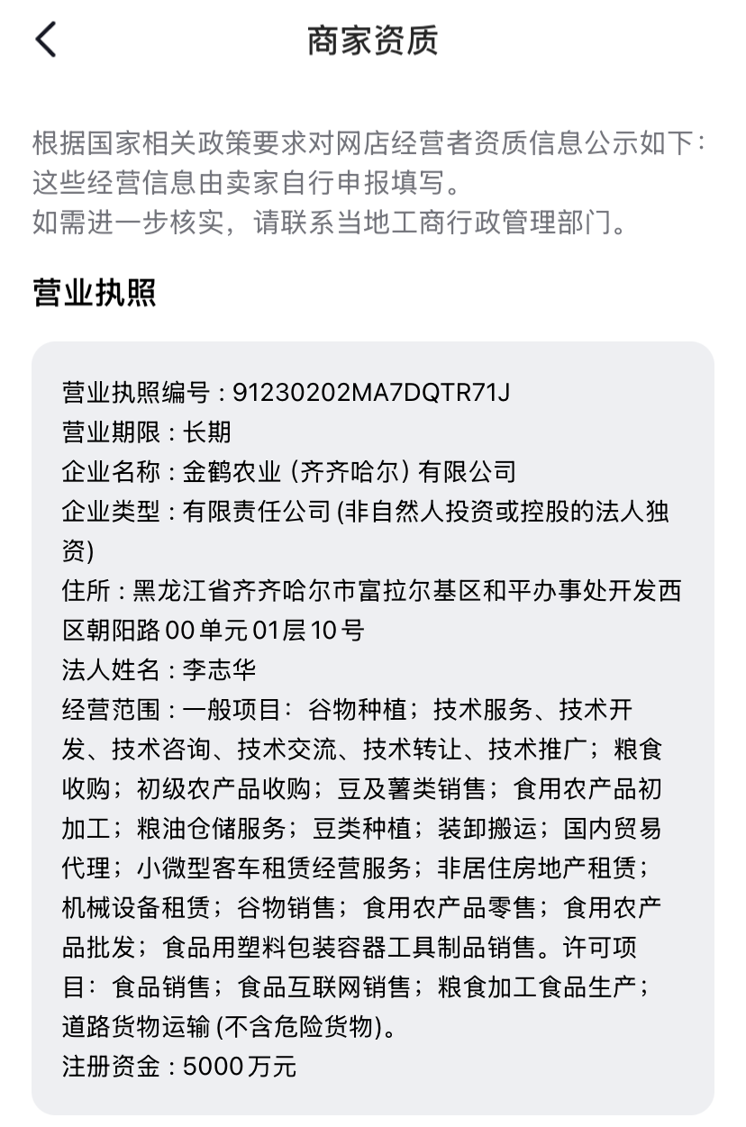 电商平台上的 “金鹤” 旗舰店,所属的黑龙江和美泰富农业发展股份有限公司,其法人也是他。