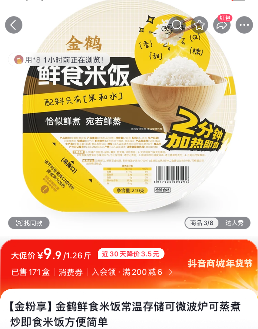 2024年1月,金鹤鲜食米饭项目开始实质性地推进,到双十一期间,首款产品已经在抖音、小象超市等平台开售。