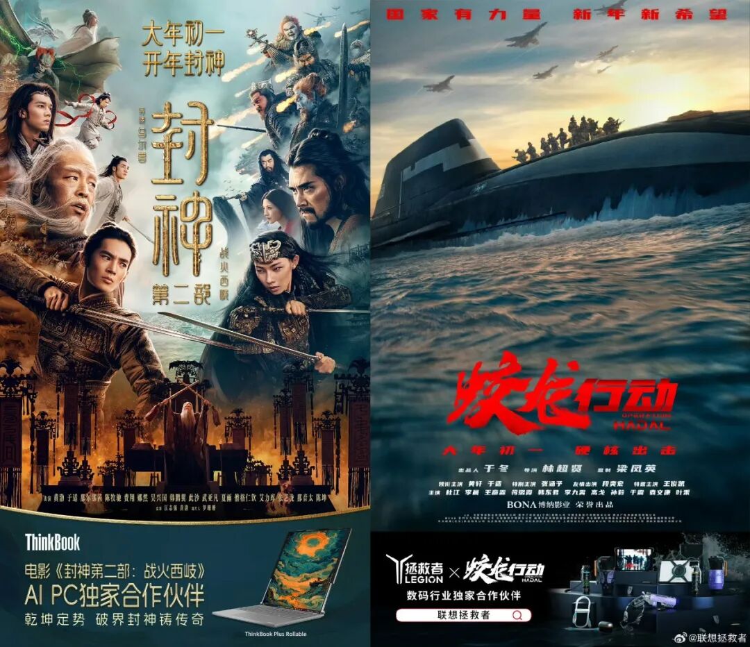 联想也不例外,定位年轻时尚的ThinkBook与《封神2》展开合作,面向游戏玩家的联想拯救者,则成为《蛟龙行动》在数码行业的独家合作伙伴。