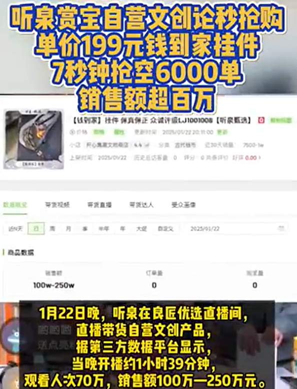 2024年10月改名“听泉赏宝”后,其商业路径彻底转向——自营文创产品销售额单月冲至2500万元,山鬼吊坠、钱到家挂件等商品屡创“7秒售罄”神话。