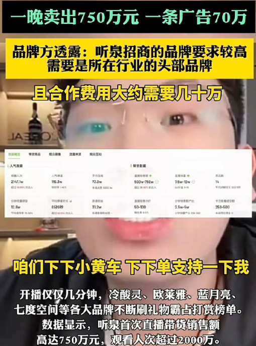 据报道,听泉赏宝开播仅仅几分钟,冷酸灵、欧莱雅、蓝月亮等各大品牌不断刷礼物霸古打赏榜单。