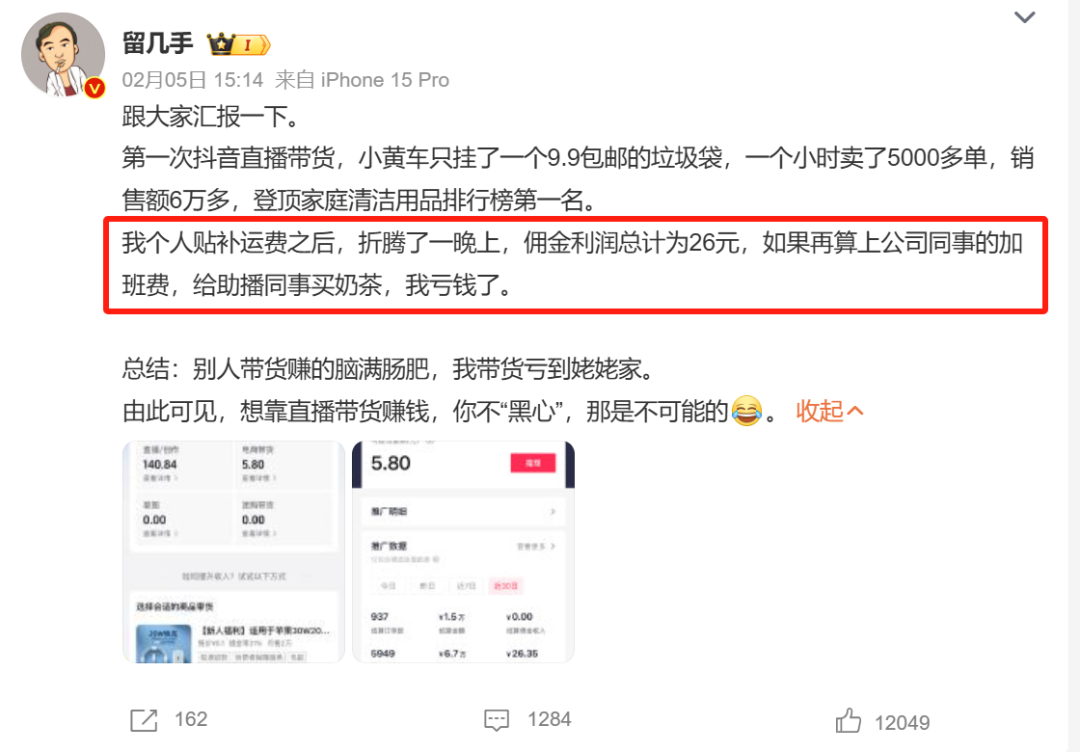 “留几手”还表示:如果再算上公司同事的加班费,给助播同事买奶茶,他非但没有赚钱,还亏本了。