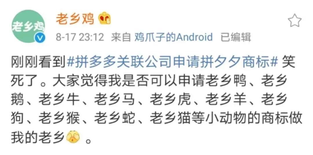 受到拼多多的启发,一向只会“咯咯哒”打鸣的老乡鸡笑完后也开始思考商标问题了。