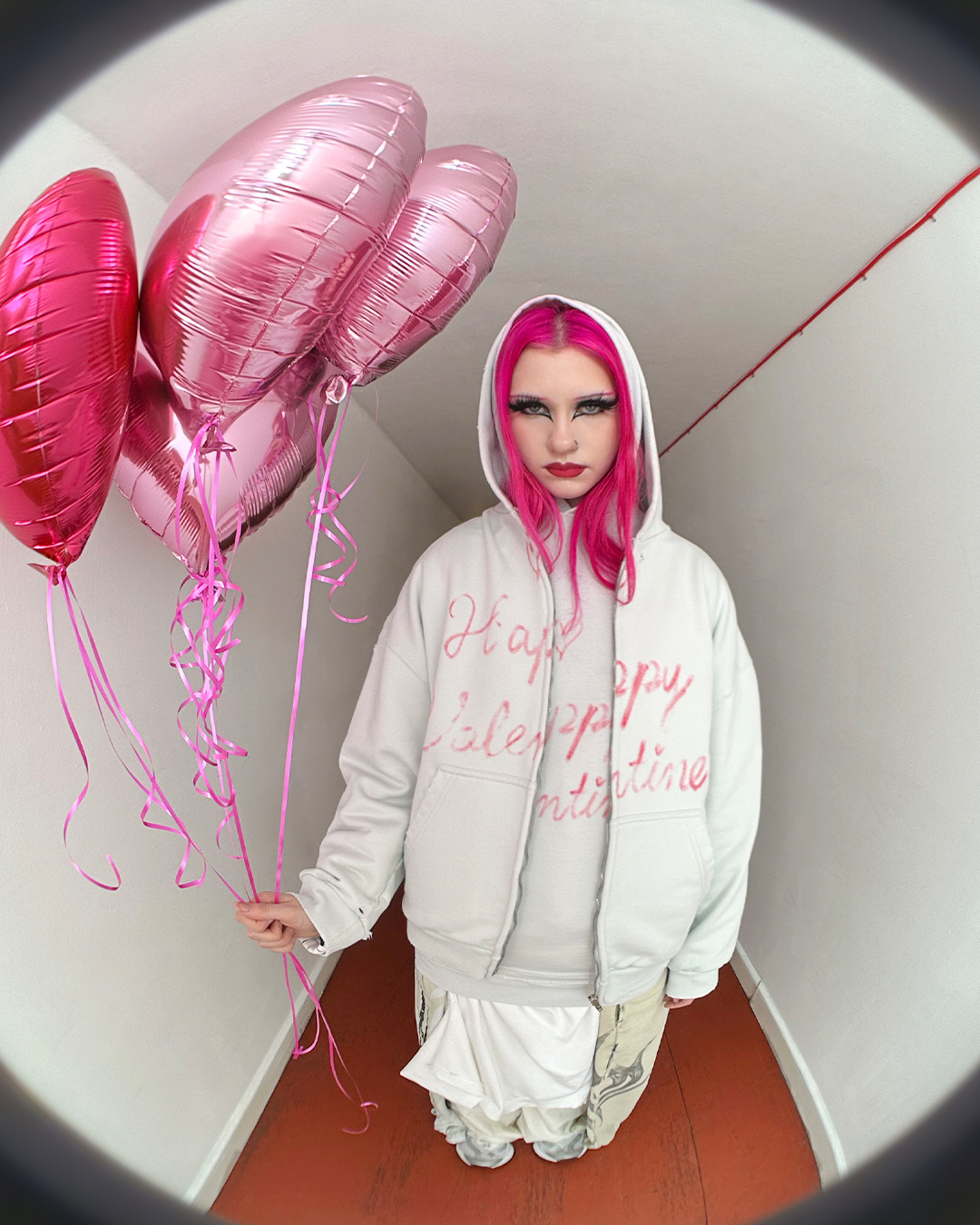 经过做旧处理的拉链连帽上衣与 T 恤,采用品牌标志性的超大号与小号版型,衣身印有仿口红字迹手写体 Happy Valentine’s Day 与一首情诗,仿佛在为心上人准备特别惊喜,令人感受到满满的诚挚心意。
