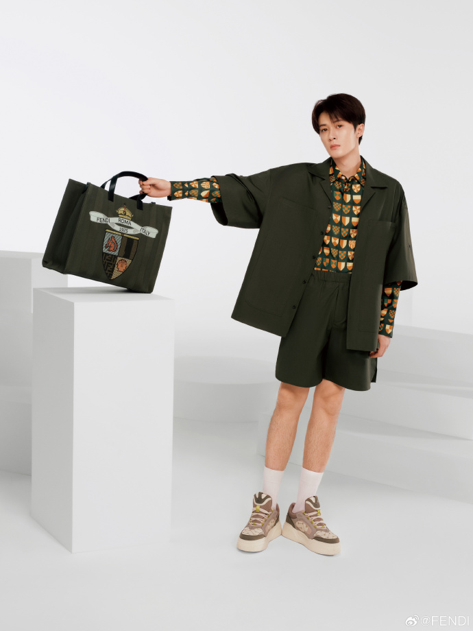 广告里檀健次身着2025春夏男士系列,搭配新款手袋,FENDI Crest纹章集合经典元素,活力诠释FENDI Club风格。