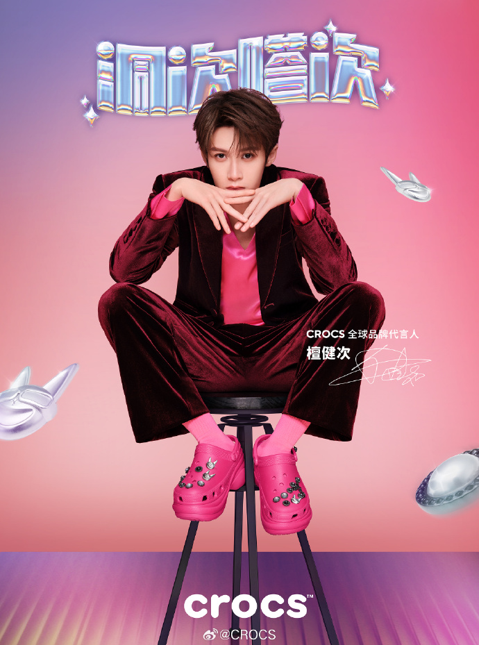 CROCS正式官宣檀健次为全球品牌代言人,丝绒西装搭配crocs鲸鱼洞洞鞋,个性展现洞门早春潮流穿搭。