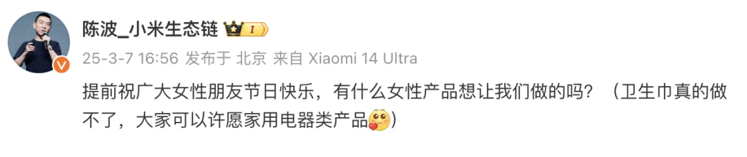 显然,小米高管把社交平台当意见收集箱,想要听取女性用户的声音,融入到市场研发调研之中,在妇女节当天也展现小米对女性的品牌关怀。