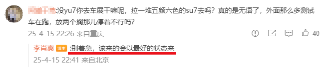 面对网友的疑问,李肖爽回应道“没有YU7。”简洁干练的几个字,有股莫名的凉感。