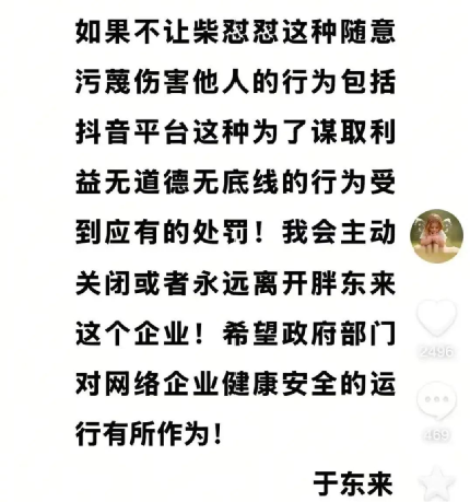 这不是欺负老实人嘛!一向和蔼可亲的于东来终于受够了,接连发布多条动态反击,还放话,如果不让柴怼怼这种随意污蔑伤害他人的行为受到应有的处罚,“我会主动关闭或永远离开胖东来这个企业!”